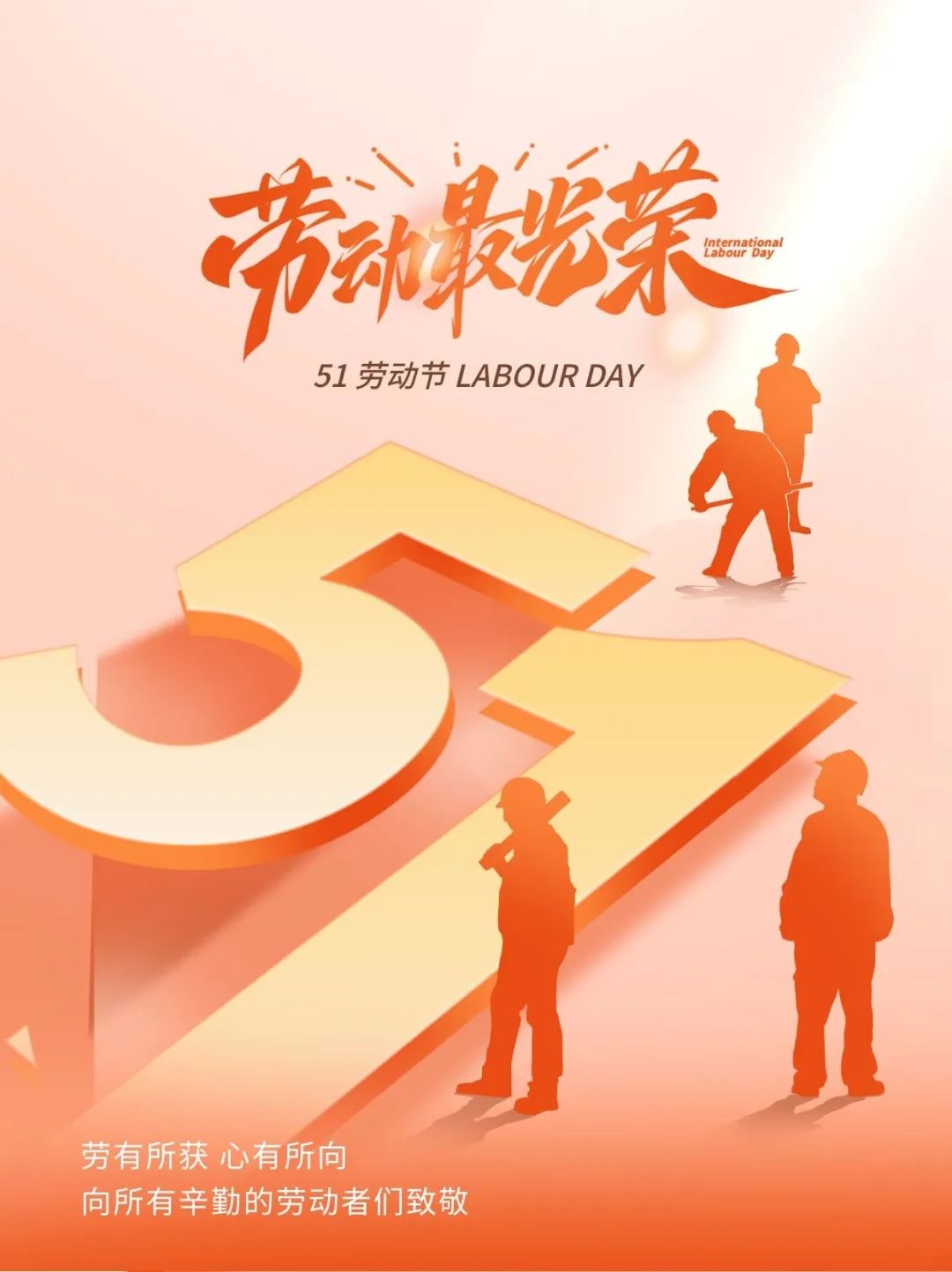 五一到来人欢笑,压力顿消烦恼跑。繁忙工作身后抛,开开心心休息好。劳逸结合生活妙,张弛有度效率高。放眼人生多美好,快快乐乐每一秒。祝五一快乐! May Day brings laughter and stress, and worries run away. Leave behind busy work and rest happily. The combination of work and rest in life is wonderful, with moderate relaxation and high efficiency. Looking at how beautiful life is, happy every second. Wishing you a happy May Day! 劳动节了,发扬我吃苦耐劳的优秀品质,为以逸待劳的你,献上举手之劳的祝福,愿你快乐不劳而获,幸福多劳多得,平安健康为你效犬马之劳,五一快乐! It's Labor Day, and I will promote my excellent qualities of hard work and endurance. To you, who waits for hard work with ease, I offer my blessings with just a little effort. May you be happy and gain without hard work, happy and hardworking, safe and healthy, and contribute to your hard work. Happy May Day!