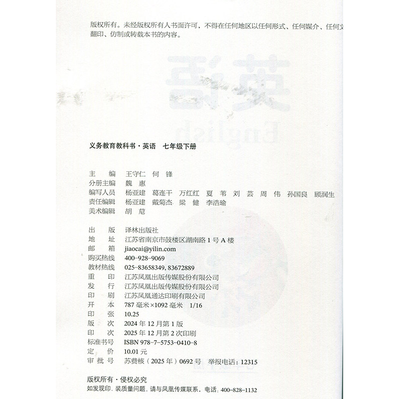 译林版七年级下册英语课本(7B)是依据国家义务教育课程标准编写的初中英语教材,适用于初中一年级第二学期使用。本书由译林出版社出版,内容系统、结构清晰,注重语言知识与实际运用相结合,涵盖听、说、读、写四项基本技能。教材话题贴近学生生活,如学校生活、家庭、节日、环保等,图文并茂,趣味性强。每单元设有语法讲解、词汇拓展和综合练习,帮助学生夯实基础、提升能力。该书为新华书店正版教材,是广大师生教学和学习的重要工具书,助力学生打好英语基础,培养跨文化交际意识。