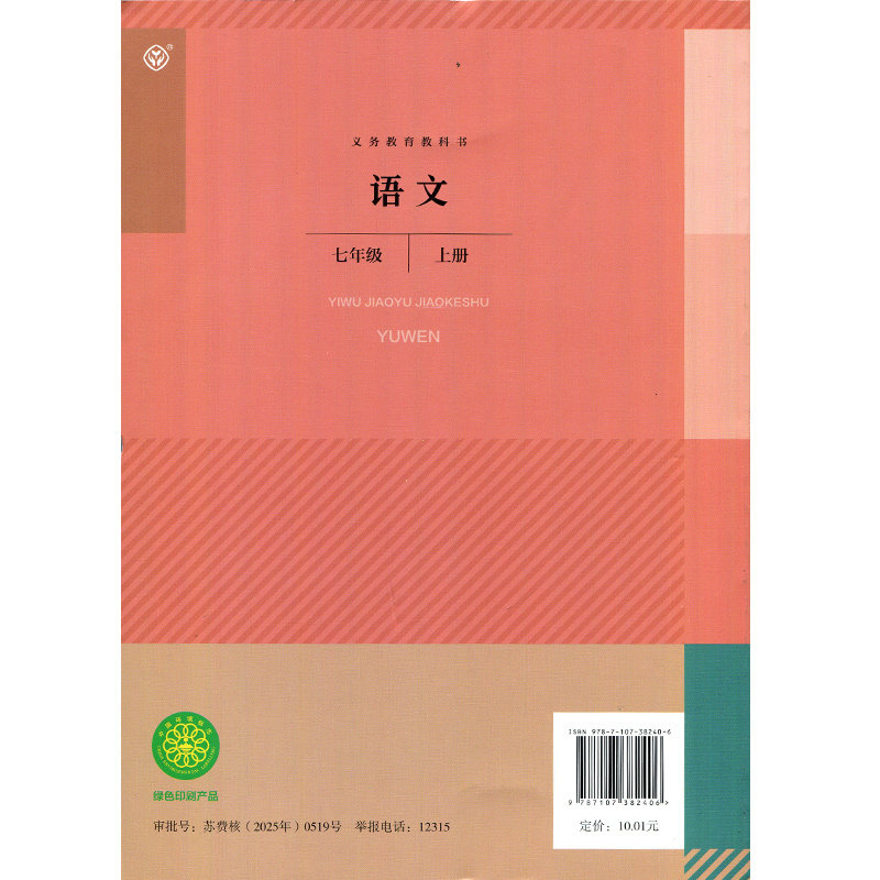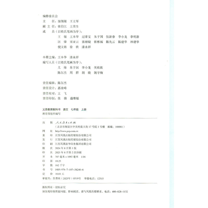 人教版七年级上册《语文》是依据《义务教育语文课程标准》编写的初中语文教科书,适用于初中一年级第一学期使用。本书由人民教育出版社出版,内容涵盖现代文、古诗文、名著导读、写作训练及综合性学习等多个板块,注重培养学生的语言运用能力、文学素养和人文情怀。教材选文经典,编排科学,贴近学生生活,兼顾思想性与艺术性。课文包括朱自清《春》、老舍《济南的冬天》、鲁迅《从百草园到三味书屋》等名篇,辅以丰富的课后练习与拓展阅读,帮助学生夯实基础、提升能力。该书为新华书店正版发行,是初中生系统学习语文的重要工具书,广受师生信赖与好评。