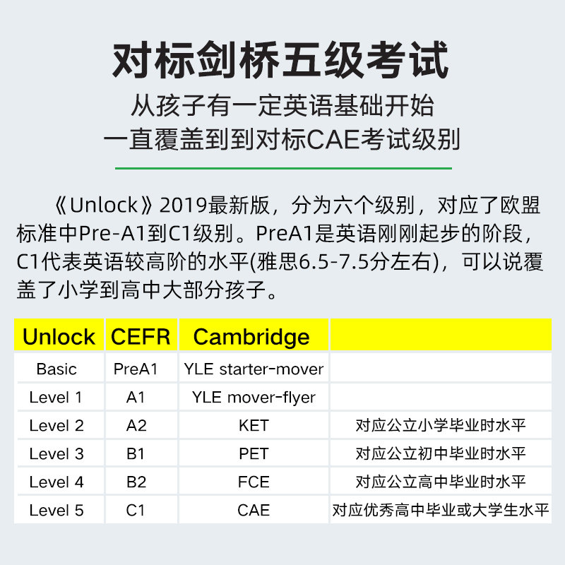 《Unlock》第三版是剑桥大学出版社推出的权威少儿英语教材,专为8-14岁学习者设计,融合剑桥英语考试体系与21世纪核心技能培养。教材以“批判性思维”和“学术能力”为核心,通过真实视频、阅读材料及跨学科主题(如科学、社会学)激发学习兴趣,系统提升听、说、读、写四项语言技能。每单元围绕一个探究性问题展开,引导孩子分析、讨论与表达,培养独立思考能力。内容紧扣CEFR标准,衔接YLE、KET、PET等剑桥英语考试,帮助学生在夯实语言基础的同时发展全球胜任力。新版优化了练习设计,增加数字化资源,支持线上线下混合学习,是提升综合英语素养的理想选择。