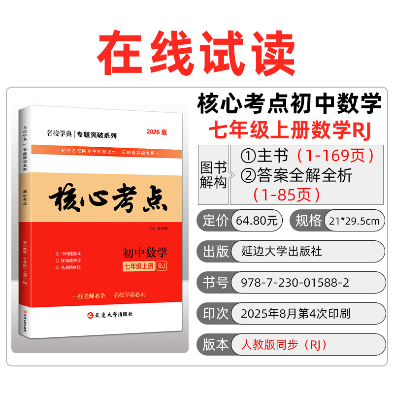 2026版《名校学典·核心考点》七八九年级数学(人教版)是一套专为初中生打造的高效学习资料,涵盖七至九年级上下册全部内容。丛书紧扣教材核心考点,融合武汉“勤学早”“大培优”“天天练”等优质教学资源,精选典型例题与名校期中、期末真题,强化基础、突破难点。每册按章节系统编排,讲练结合,配有详细解析,助力学生夯实知识体系,提升解题能力。特别适用于同步复习、阶段检测与考前冲刺,是初中生迈向满分的得力助手,广受师生好评。