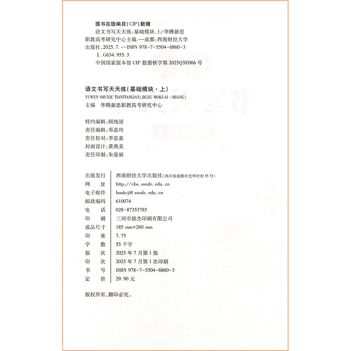《中职生字帖·语文书写天天练》是专为中等职业学校学生设计的一套硬笔书法练习字帖,由华腾新思与西南财经出版社联合出版,紧扣高等教育出版社统编教材《语文》基础模块(上下册)及职业模块内容,实现课文同步练字。字帖采用描红与临写结合的方式,帮助学生规范汉字书写,提升硬笔书法水平。内容涵盖课文重点字词、句段,注重实用性与规范性,适合中职学生日常书写训练。通过天天练习,强化字形结构、笔顺规则,培养良好的书写习惯,助力语文学习与职业素养双重提升,是中职生夯实书写基础的理想配套工具。