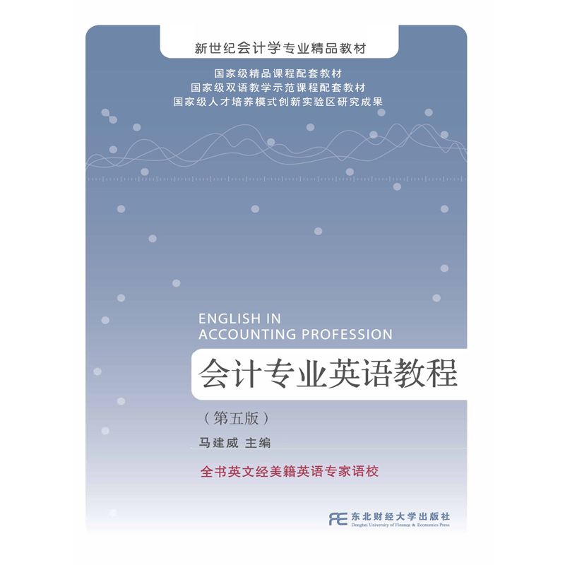 《会计专业英语教程》(第五版)是新世纪会计学专业精品教材之一,由马建威主编,东北财经大学出版社出版(ISBN:9787565457623)。本教材紧扣会计学科国际发展趋势,内容涵盖财务会计、管理会计、审计、税务及国际会计准则等核心领域,语言规范、专业性强,注重理论与实践结合。全书采用中英对照方式,辅以案例分析、专业术语解析和练习题,帮助学生提升会计英语阅读与表达能力。第五版在原有基础上更新了国际财务报告准则(IFRS)相关内容,融入数字化会计与可持续发展报告等前沿主题,适合作为高校会计、财务管理等专业双语教学用书,也可供会计从业人员提升专业英语水平参考使用。