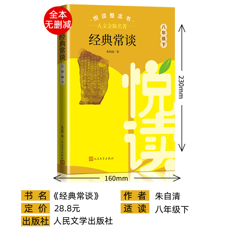 《人文金版经典常谈》八年级下册是专为初中生设计的统编语文配套阅读名著,由人民文学出版社正版出版,内容完整无删减,忠实呈现原著风貌。本书精选适合八年级学生阅读的经典文学作品,涵盖中外名家名作,语言规范,思想深刻,有助于提升学生的文学素养与阅读理解能力。作为“悦读整本书”系列的重要组成部分,该书注重阅读体验,编排科学,配有导读、批注与思考题,引导学生深入文本、独立思考。无论是课内学习还是课外拓展,都是提升语文综合能力的优质读本,助力学生在经典阅读中汲取人文精神,培养终身阅读习惯。