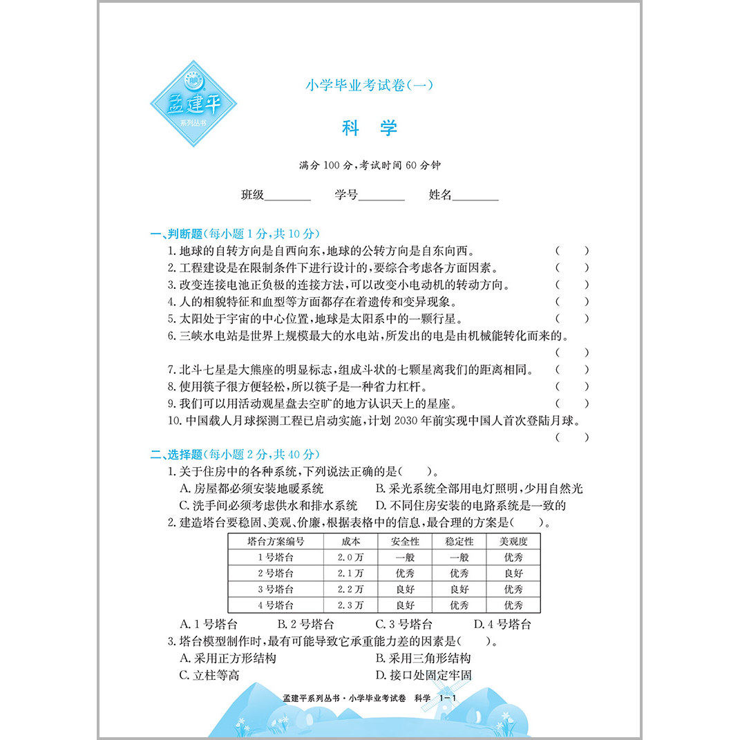 《孟建平小学科学毕业考试卷》专为六年级学生小升初科学复习打造,涵盖毕业升学总复习、模拟试卷、专项训练及真题演练,内容紧扣新课标和教材重点。试卷精选典型题型,强化实验探究、知识应用与综合思维能力训练,帮助学生系统梳理知识点,查漏补缺。书中包含多套全真模拟卷和近年真题,难度梯度合理,适合课堂同步练习、暑假衔接及考前冲刺使用。搭配详细解析,便于学生自主学习与巩固提升,是小学科学高效复习的理想工具书,助力学生顺利衔接初中科学学习。
