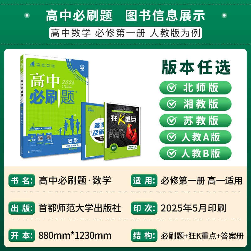 2026版《高中必刷题》系列教辅,涵盖数学必修二、高一物理化学生物、高二语文英语上册及下册,同步人教版教材,精准对接新课标要求。丛书精选典型例题与分层训练题,强化基础、突破重难点,配有“狂K重点”栏目,提炼核心考点,助力高效复习。同时包含选择性必修三试卷及地理、历史选修专项训练,题型全面,难度梯度合理,适合课堂同步练习与阶段性检测。答案详解详尽,便于自学自查,是高中生夯实基础、提升成绩的理想资料。