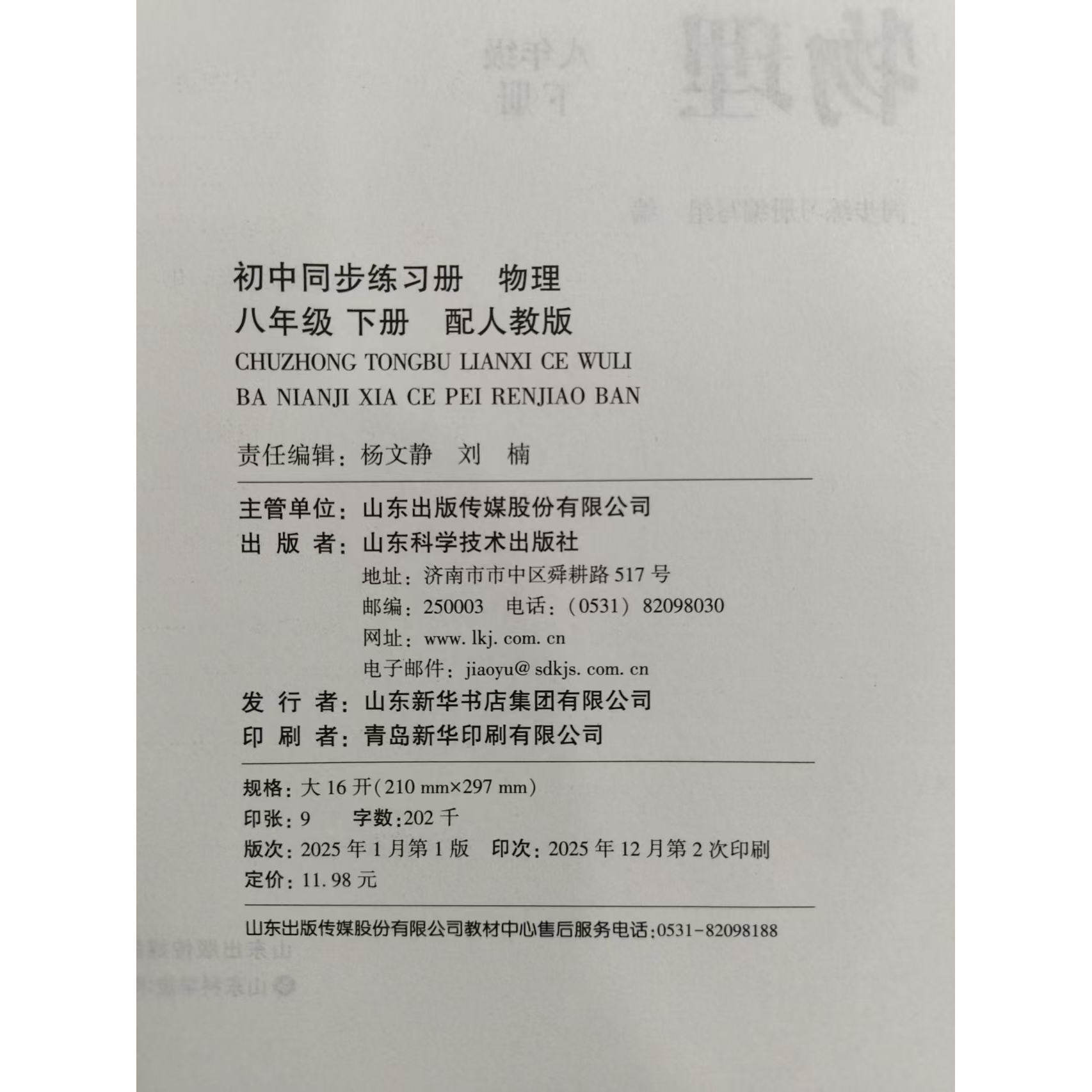 天猫2026春配人教版初中同步练习册物理八年级下册山东科学技术出版社初中八年级物理下册同步配套练习册下学期初二8年级物理同步练习
