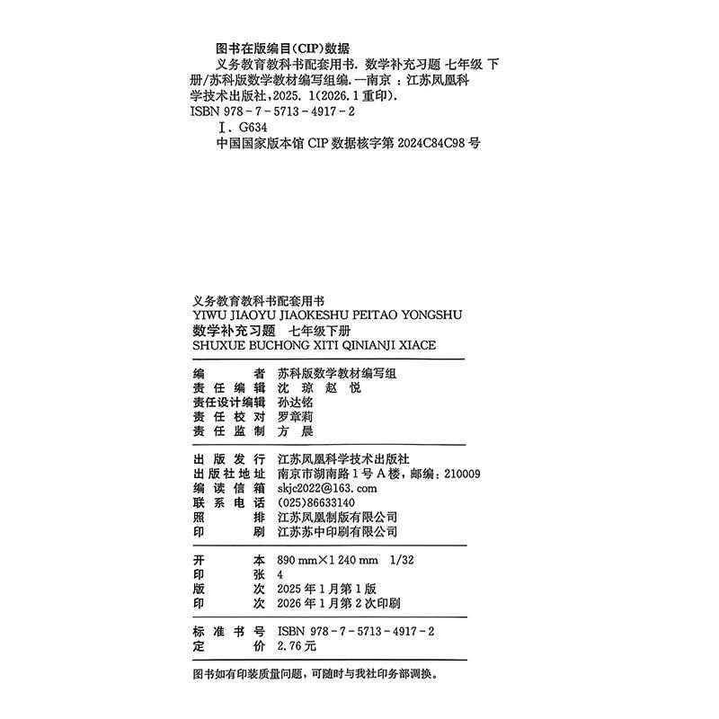 2026年春新版《补充习题 数学 七年级下册》由江苏凤凰科学技术出版社精心编写,依据最新苏科版初中数学课程标准,紧扣七年级下学期教学进度。本书内容覆盖实数、代数式、一元一次方程、二元一次方程组、不等式与不等式组、平面图形认识等核心知识点,题型丰富,梯度合理,注重基础巩固与能力提升相结合。习题设计贴近生活实际,强化数学思维训练,配有详细解析,便于学生自学与教师讲评。作为课堂教学的有效补充,本书助力学生夯实基础、拓展思维,提升综合解题能力,是师生广泛认可的优质同步练习资源。