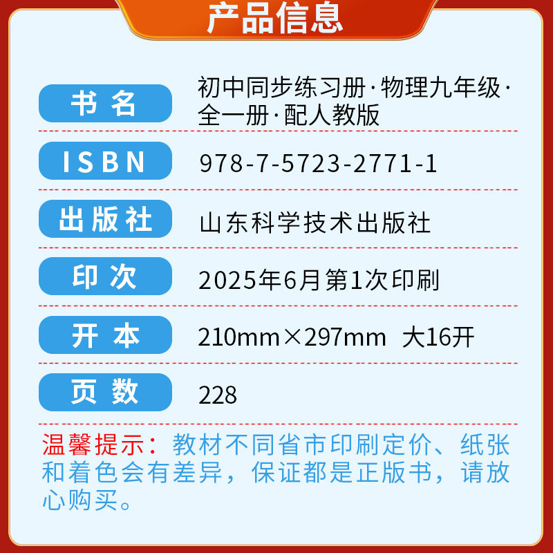 2025秋新版《初中同步练习册·物理九年级全一册》(配人教版·六三制)由山东科学技术出版社精心编写,紧扣最新课标要求与人教版教材内容,同步课堂教学进度。本书结构清晰,分为课时练、章末复习与综合检测三部分,题型丰富,涵盖基础巩固、能力提升与拓展探究,注重知识理解与实际应用相结合。题目设计贴近生活、突出实验探究,强化物理思维训练。同时配备详细解析,便于学生自查自纠,教师讲评参考。适用于山东地区及其他使用六三制人教版教材的九年级学生,是夯实基础、提升成绩的理想同步练习资料。