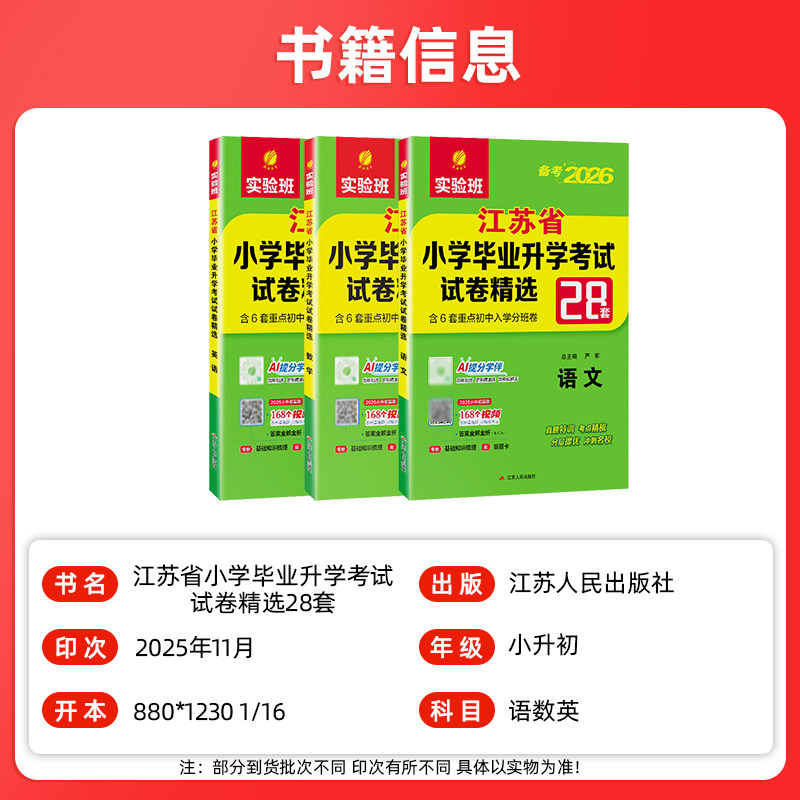 《2026版小升初试卷·江苏省小学毕业升学考试试卷精选28套》由春雨教育精心编写,专为五六年级学生升学备考设计。全套涵盖语文、数学、英语三科,精选江苏省近年真题及优质模拟题,紧扣苏教版教材要点,系统梳理知识体系,强化重点难点突破。试卷结构科学,题型贴近实际考试,注重能力训练与应试技巧提升。每套试卷均附详细解析,帮助学生查漏补缺、高效复习。作为“实验班”系列经典教辅,本书助力学生夯实基础、冲刺高分,是小升初总复习的权威必备资料,广受师生好评。