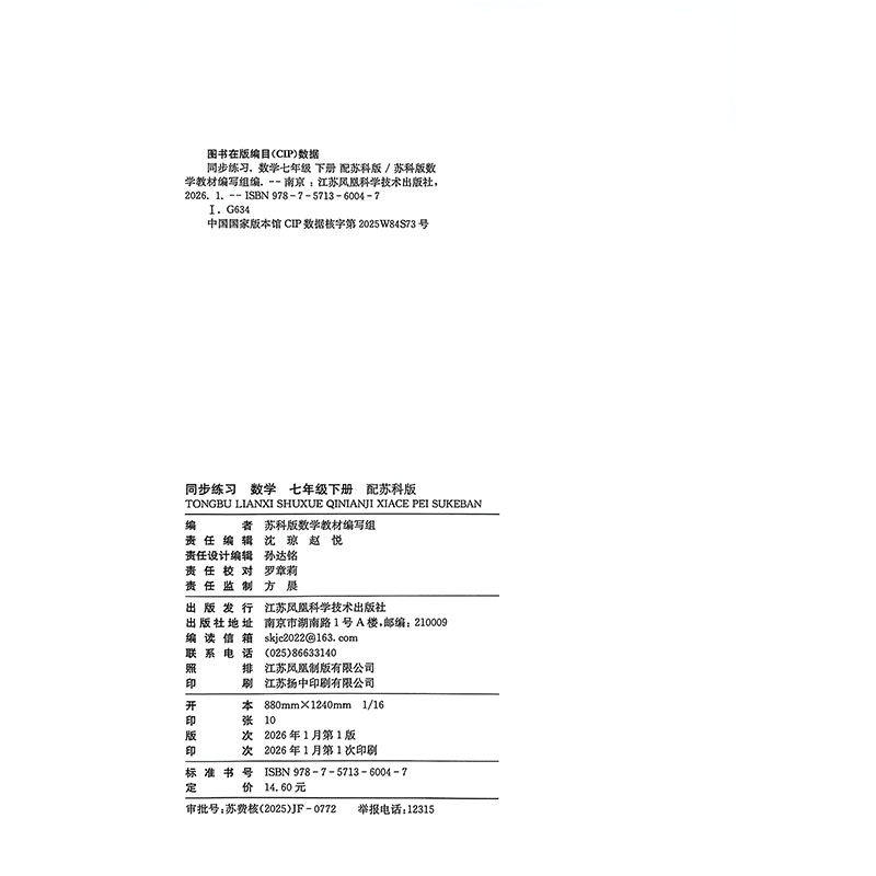 2026年春季同步练习《数学七年级下册》(苏科版·双色版)由江苏凤凰科学技术出版社出版,专为初一年级学生设计,紧扣教材内容,系统梳理知识点,注重基础训练与能力提升。本书采用双色印刷,版面清晰,题型丰富,涵盖选择题、填空题、解答题等多种形式,并配有详细参考答案,便于学生自查自纠、巩固所学。作为配套教辅,它与课堂教学同步,帮助学生及时复习和强化重点难点,提升数学思维能力。不含活页卷设计,便于携带与使用,是七年级学生课后练习、夯实基础的优质学习资料。