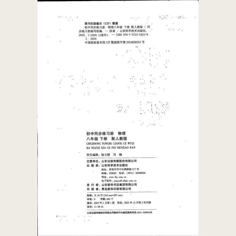 《2026初中同步练习册·物理(八年级下册)》配人教版,由山东科学技术出版社出版,紧扣最新课程标准与人教版教材内容,系统梳理八年级下册物理知识点。本书题型丰富,涵盖基础巩固、能力提升与拓展探究,注重实验探究与生活应用,帮助学生夯实基础、提升思维能力。每节配有知识要点归纳与典型例题解析,章末设置综合测试,便于查漏补缺。答案详解独立成册,便于学生自查自纠。本书同步课堂教学进度,适合山东地区初中生日常练习与复习使用,是提升物理学习效率的优质教辅资料。