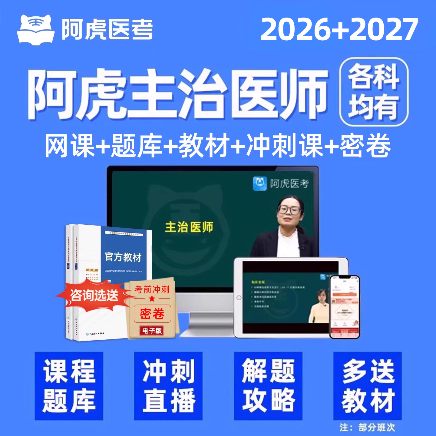 2026年阿虎医考主治医师中级职称考试辅导资料,涵盖内科、超声波医学、全科、口腔、重症、急诊、康复及放射医学等多个专业,紧扣最新考试大纲。课程包含历年真题库、冲刺网课、人卫版权威教材配套讲义、全真模拟试卷及考前押题密卷,系统梳理高频考点,强化实战能力。由资深讲师团队精讲重难点,结合典型例题解析,帮助考生高效备考。资料内容精准、更新及时,注重理论与实践结合,助力考生全面掌握考试要点,提升通过率,是备战主治医师中级职称考试的优质学习资源。