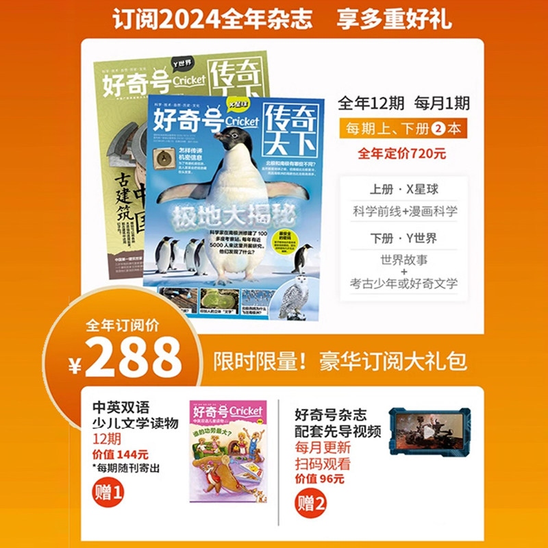 《好奇号》杂志2026年1-3月新推出全年/半年订阅服务,专为6-12岁小学生打造,内容涵盖科学、技术、自然、历史等多领域,图文并茂,趣味性强。订阅2025年全年杂志即赠精美双语册子,助力孩子提升英语阅读能力。同时加赠2022-2024年《阳光少年报》过刊珍藏合集,包含三年精选科普内容,知识丰富、视野开阔。杂志融合国际前沿科学资讯与本土教育理念,激发孩子探索精神与创造力。无论是课内拓展还是课外兴趣培养,《好奇号》都是理想选择。现在订阅,畅享超值礼包,让孩子在阅读中收获成长与乐趣。
