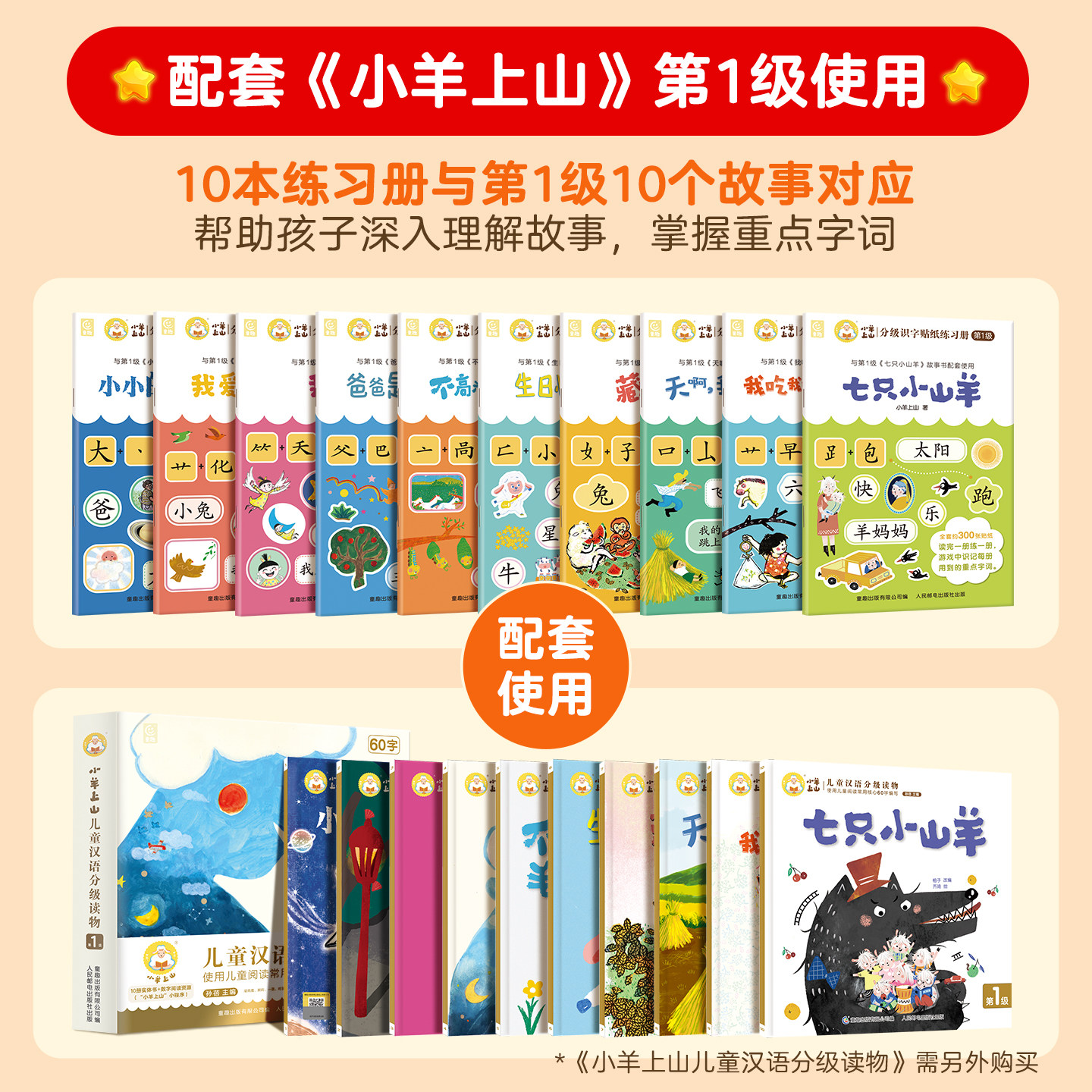 天猫小羊上山分级识字贴纸练习册第1级全套10册幼小衔接识字书幼儿认字幼儿园儿童早教启蒙贴纸书适合3-8岁分级读物系列阅读闯关贴纸