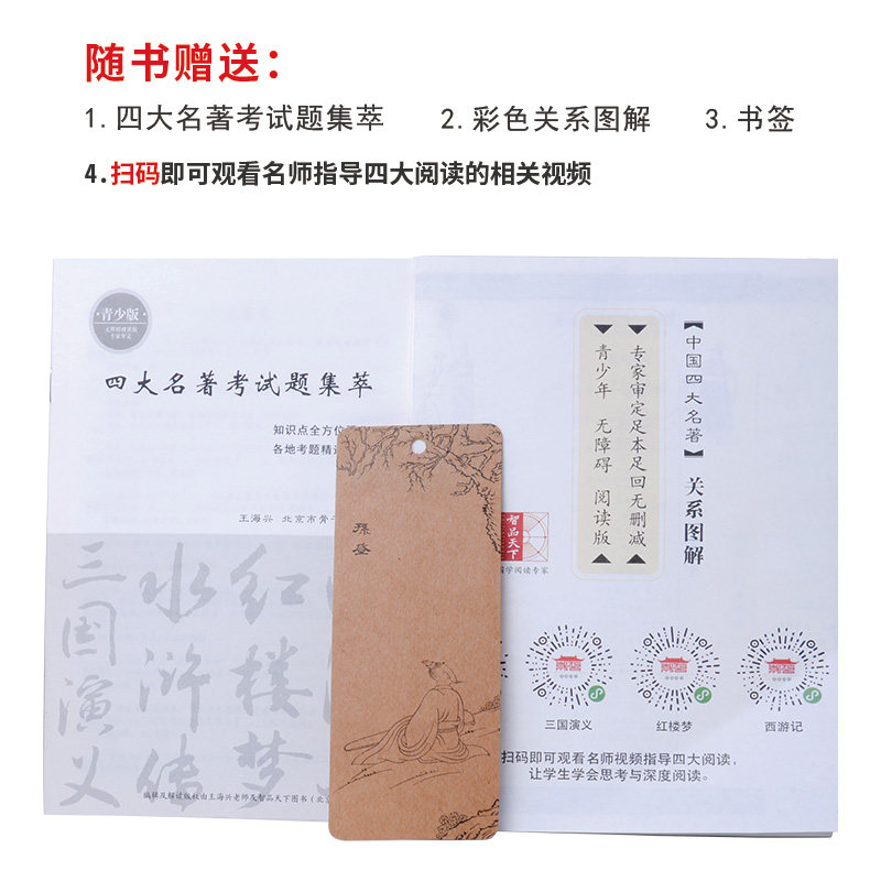 【现货速发】四大名著无障碍阅读足本足回套装,包含《红楼梦》《三国演义》《水浒传》《西游记》,全文无删减,专为青少年打造,语言通俗易懂,助力轻松理解经典。每册均附赠精美彩色人物关系图,帮助理清复杂人物脉络;精选高频考题考点,助力语文学习与考试备考;另赠精美书签,扫码即可观看配套精讲视频,深入解读名著精髓。四大名著是中国古典文学巅峰之作,本套书兼顾阅读体验与学习功能,是学生课外阅读、提升文学素养的理想之选。现货速发,即买即读,开启经典阅读之旅!