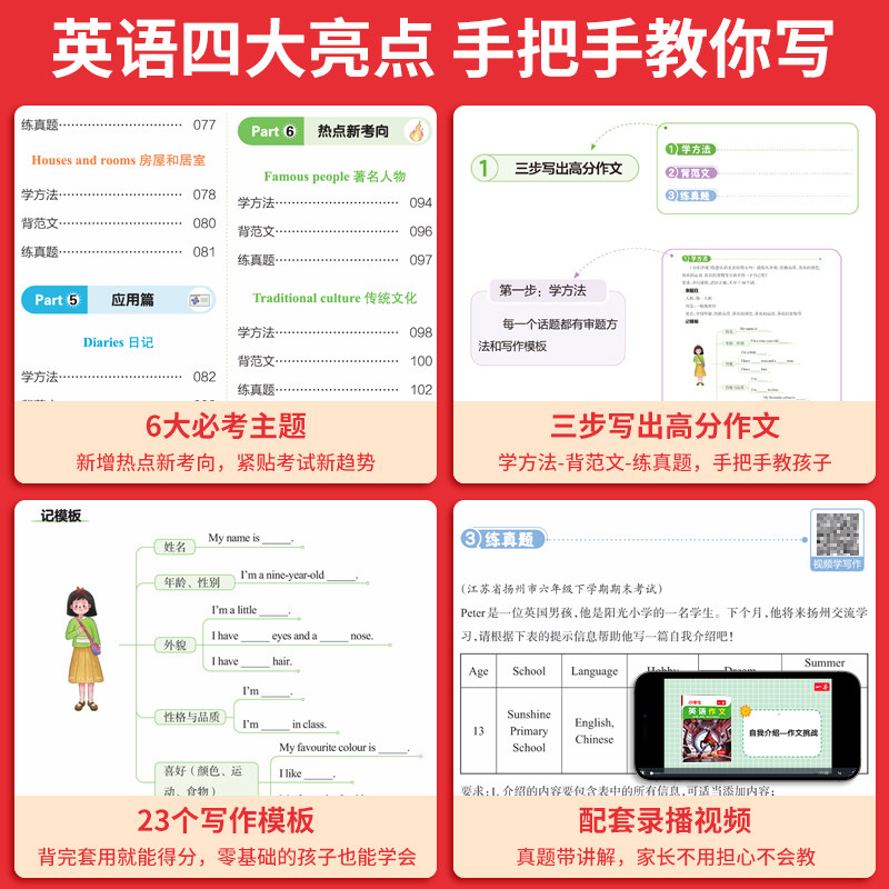 《小升初英语满分作文必背范文》专为四至六年级学生打造,紧扣小升初英语考试热点话题,精选常考主题如自我介绍、家庭朋友、校园生活、节日习俗、环保健康等,提供高质量满分范文。每篇范文结构清晰、语言地道,搭配实用写作方法与高分句型,帮助学生快速掌握写作技巧。同步语文热点话题,实现双语思维联动,提升综合表达能力。书中还附赠精选素材库与写作模板,便于背诵与仿写,助力学生在考场上轻松应对、稳拿高分,是小升初英语写作的高效提分利器。