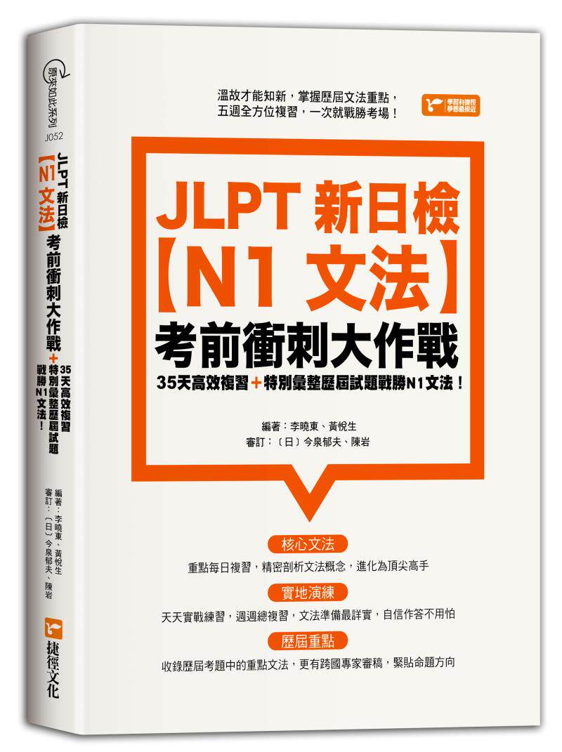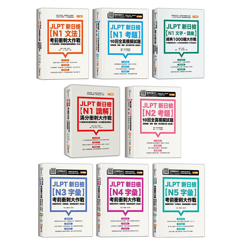 《JLPT新日检N1~N5考题文法字汇模拟试题考前冲刺大作战》是一套专为准备日本语能力试验(JLPT)的学习者精心编写的港台原版教材。本书涵盖N1至N5各级别,精准对应最新考试大纲,系统整理高频文法、核心词汇及实用句型,并附有大量模拟试题与详细解析,帮助考生熟悉题型、掌握应试技巧。内容编排由浅入深,适合不同水平学习者使用。书中题目贴近真实考试难度,强化实战训练,有效提升阅读、听力与语言知识综合运用能力。无论是自学或课堂辅助,都是冲刺高分的理想选择,助力考生高效备考,顺利通过新日检各级考试。