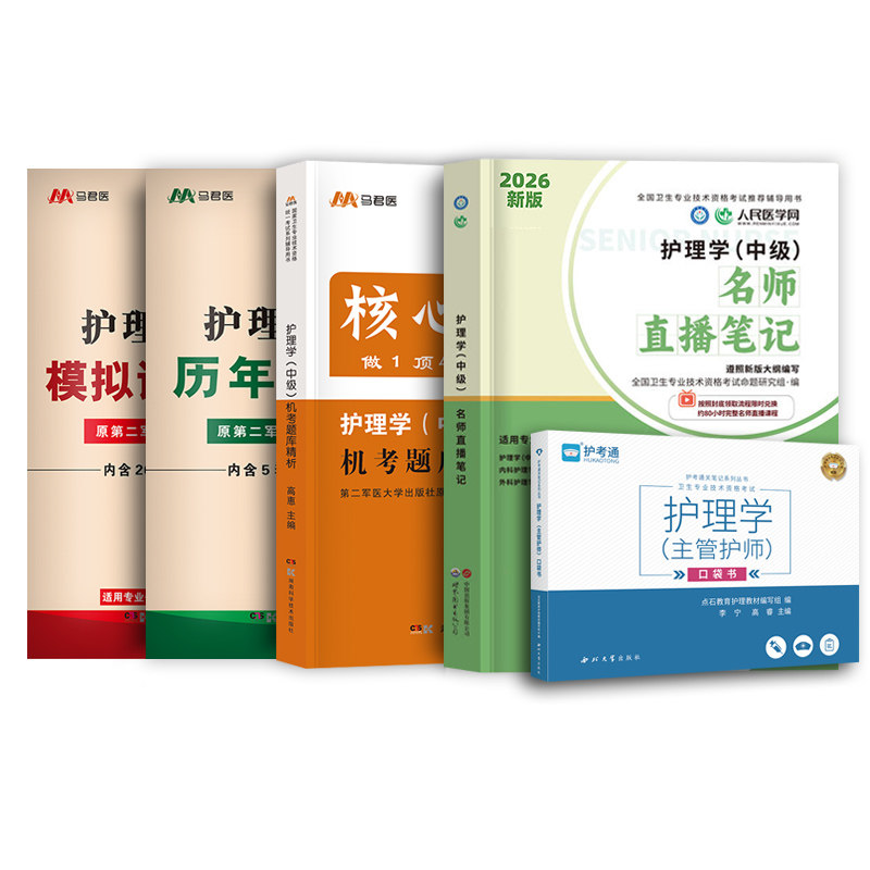 《2026年主管护师中级护理学名师直播笔记机考题库》套装共5本,专为备考主管护师考试的考生精心打造。内容涵盖名师直播精华笔记、1500道精选机考题库、历年真题模拟试卷及便携口袋书,全面覆盖考试大纲重点与高频考点。题目紧贴最新命题趋势,解析详尽,助力考生高效掌握核心知识。搭配人卫、军医权威版本教材使用,复习更系统、备考更高效。无论是基础巩固还是冲刺提分,本套装均为理想选择,帮助考生顺利通过中级主管护师资格考试。