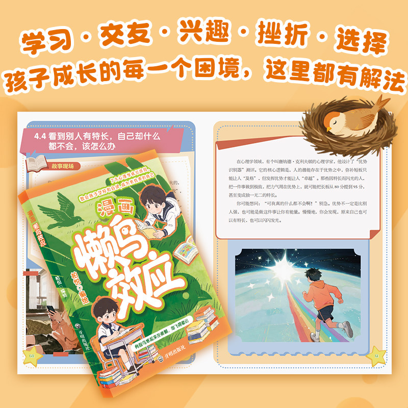 《抖音同款·懒鸟效应漫画版》是一本专为小学生打造的心理学智慧绘本,由张雪创作,正版授权。本书以生动有趣的漫画形式,讲述“懒鸟效应”与“阳谋”的成长哲理,帮助孩子理解自律、努力与坚毅的重要性。通过蓝鸟积极行动、克服拖延的励志故事,引导孩子主动规划时间、培养良好习惯。语言浅显易懂,画面活泼可爱,寓教于乐,深受家长和孩子喜爱。适合6-12岁儿童阅读,是提升心理韧性、激发内在动力的优质读物,被众多教育博主推荐为成长必备绘本。