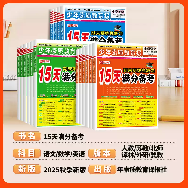《2025新版下册15天满分备考·少年素质教育报》专为小学一、二、四、五、六年级学生设计,紧扣人教版、北师大版教材,聚焦语文、数学、英语三科期中期末总复习。本书以“高频考题”为核心,系统梳理重点难点,科学规划15天高效复习计划,帮助学生在考前快速突破。内容涵盖基础知识巩固、典型题型解析与实战模拟训练,题型新颖、贴近真题,注重能力培养与应试技巧结合。编排清晰,讲练结合,适合学生自主复习与家长辅导使用,是小学生冲刺满分的优质备考资料,助力轻松应对考试,提升综合素养。