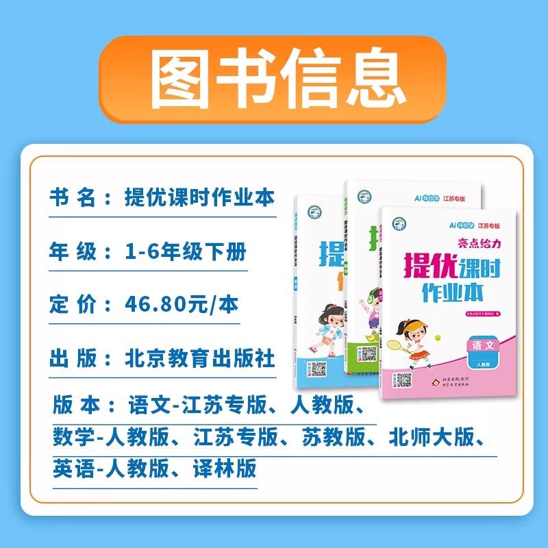 《2026春亮点提优课时作业本》是一套专为小学一至六年级学生设计的同步练习册,涵盖语文、数学、英语三科,适配人教版、苏教版、译林版、江苏版等多种教材版本。本书紧扣课时进度,内容精准对接课堂教学,每课设置基础巩固与能力提升双层次练习,帮助学生夯实基础、拓展思维。题型丰富多样,包括填空、选择、连线、阅读理解等,注重知识点的灵活运用。同时配有“天天练”模块,强化日常积累,提升学习效率。编排科学,题量适中,图文并茂,适合学生课后巩固、家长辅导及教师检测使用,是提升学业水平的优质助学资料。