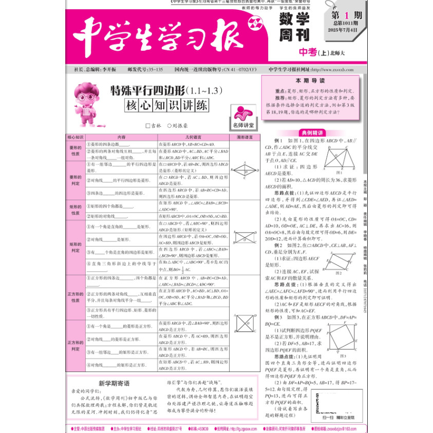 《2025中学生学习报》上册下册共24期,专为九年级初中生设计,涵盖语文、数学、英语三大学科,适配人教版、北师大版、沪科版、仁爱版等多种教材版本,内容紧扣新课标与中考考点。报纸精选优质习题、专题讲解与备考策略,帮助学生夯实基础、提升综合能力。每期设有知识梳理、难点突破、真题演练等栏目,兼顾同步学习与复习巩固。版面设计清晰,语言通俗易懂,适合课堂辅助与课后自学。订阅全年24期,系统助力学生高效备考,是九年级学生提升成绩、迎战中考的理想学习资料。