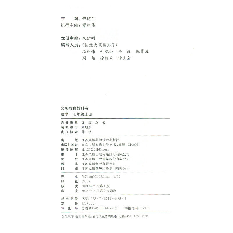 苏科版七年级上册《数学》是依据国家义务教育课程标准编写的初中数学教材,适用于初一上学期学生使用。本书以“数与代数”“图形与几何”“统计与概率”为主线,注重基础知识的掌握与数学思维的培养。内容由浅入深,例题典型,习题分层设计,兼顾不同层次学生的学习需求。教材强调数学与生活的联系,通过实际问题引导学生探究,提升应用能力。同时配备丰富的图表、探究活动和数学文化拓展,激发学习兴趣。作为新华正版教材,内容权威、印刷清晰,是初中生系统学习数学、夯实基础的重要工具书,深受广大师生信赖。