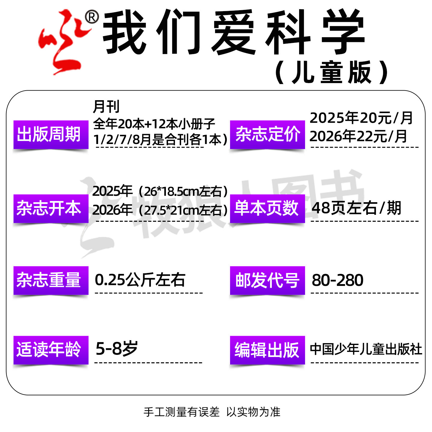 《我们爱科学》儿童版杂志升级版(2025/2026年1-12月)专为小学生打造,融合趣味画报、地理探索与科普知识,内容涵盖自然、科技、历史与万物奥秘。升级版图文并茂,语言生动,激发孩子好奇心与求知欲。全年/半年订阅可选,1月起现货发售,包含《博物》《万物》《好奇号》等优质过刊精选,知识系统且前沿。每期设置互动实验、趣味问答,寓教于乐,助力孩子拓宽视野、提升科学素养。是家长信赖、孩子喜爱的科普读物,陪伴孩子开启探索世界的精彩旅程。