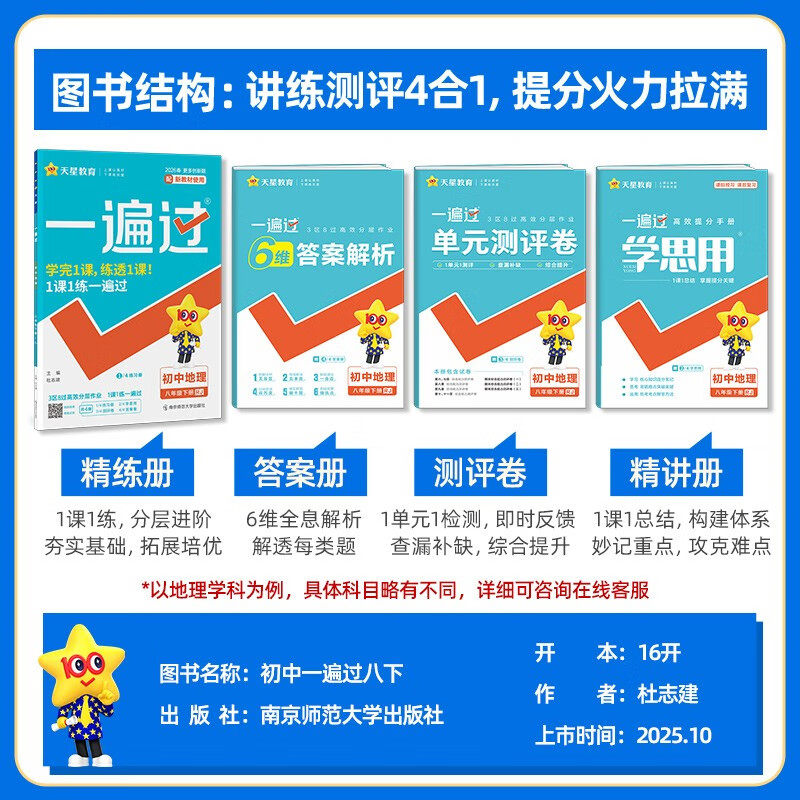 2026春版《初中一遍过》系列同步练习册,涵盖七年级至九年级上册下册全学科,包括数学、英语、物理、化学、语文、政治、历史、地理、生物等九大学科,严格依据人教版教材编写,紧扣新课标要求。本书融合“讲—练—测”一体化设计,精选典型例题,分层设置基础巩固、能力提升与中考链接题型,帮助学生高效掌握知识点。配套单元测试卷与期中期末模拟卷,强化实战训练,提升应试能力。题型新颖,解析详尽,适合初一至初三学生同步学习与复习使用,是夯实基础、突破重点难点的优质教辅资料,助力学生轻松应对各类考试。