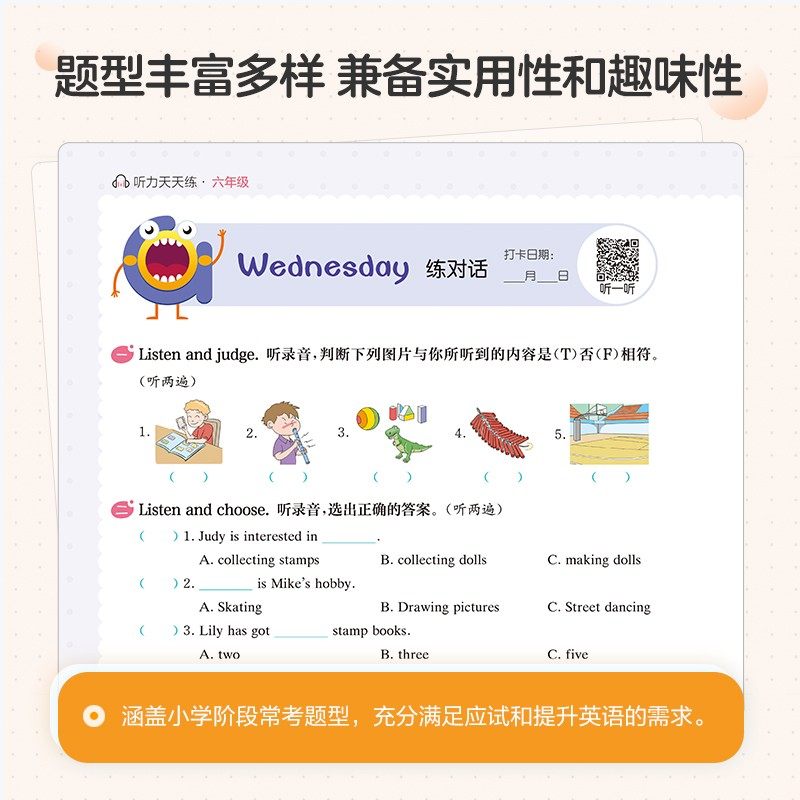 《2025星火英语小学英语听力专项训练》是一套专为小学生设计的系统性听力提升丛书,涵盖一至六年级上下册及小升初阶段,分年级编写,内容紧扣课标要求与教材话题。丛书采用“听力天天练”模式,每日精选短对话、情景问答、短文理解等题型,难度循序渐进,帮助学生夯实基础、提升听力理解能力。配套音频由专业外教朗读,语速适中,发音标准,支持扫码即听,方便自主学习。同时融入“英语阅读天天练”拓展内容,实现听读结合,全面提升语言素养。适合课堂同步练习与家庭巩固使用,是小学生英语听力训练的高效助手。
