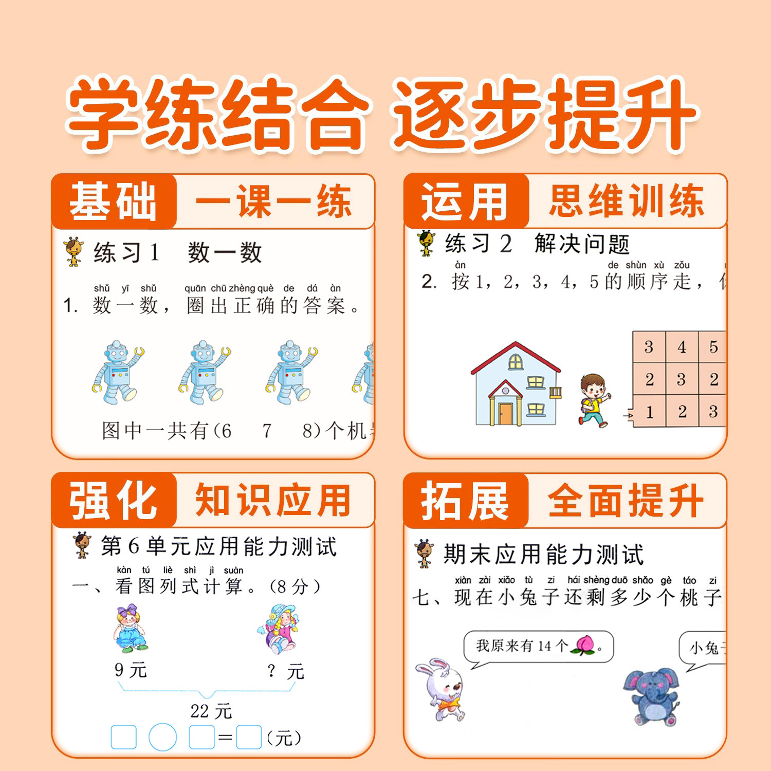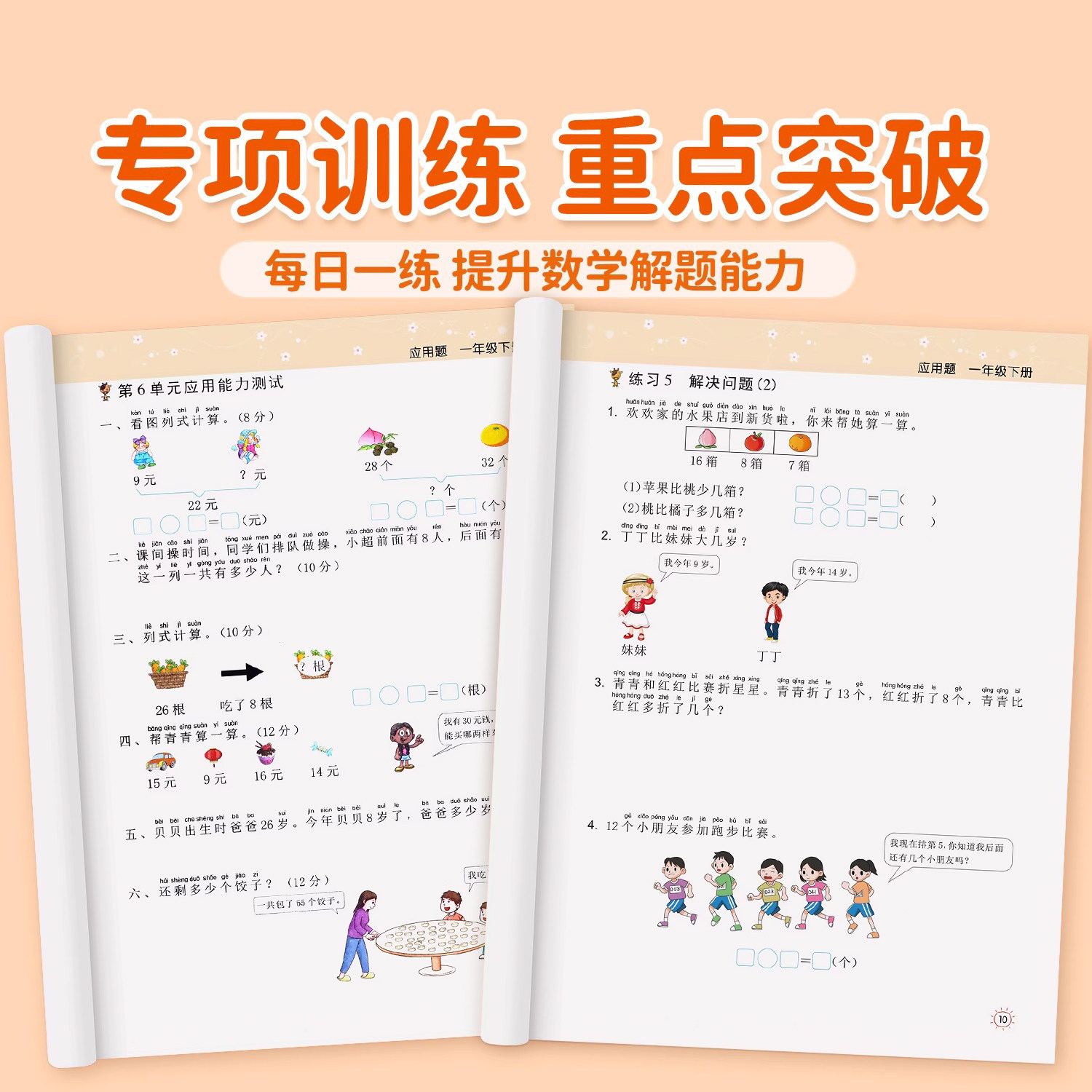 《一年级上下册数学应用题专项训练》是人教版专为幼升小及一年级学生设计的思维训练练习册,紧扣教材内容,系统强化应用题解题能力。本书涵盖加减法、图形认知、简单逻辑等核心知识点,通过生活化情境设置题目,帮助孩子理解数学在实际中的应用。题型由易到难,循序渐进,注重培养孩子的审题能力、分析能力和逻辑思维。每道题均配有清晰解析,便于家长辅导与孩子自主学习。同步课堂进度,强化幼小衔接,同时融入奥数启蒙思维训练,提升数学兴趣与综合素养,是巩固基础、拓展思维的理想练习材料。