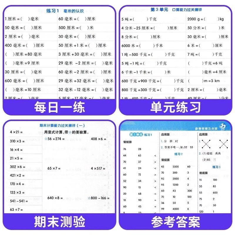 三年级上下册口算天天练人教版数学计算题每日一练小学3年级强化专项训练同步练习题册口算题卡竖式解题技巧计算高手三合一应用题