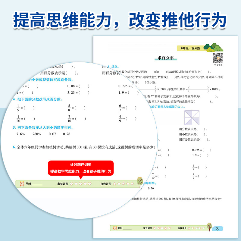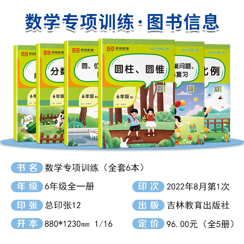 《数学专项训练六年级上册》紧扣人教版教材,系统覆盖“比和比例”“百分数与扇形统计图”“分数乘除法”“圆”“位置与方向”等核心知识点。本书题型丰富,梯度分明,既有基础巩固题,也有拓展提升题,注重思维训练与实际应用相结合。通过每日一练的“思维天天练”模块,帮助学生夯实基础、提升解题能力,培养逻辑思维与数学素养。题目设计贴近生活,图文并茂,尤其强化扇形统计图的读图与分析及圆的周长、面积计算。同步课堂进度,是六年级学生课后练习、查漏补缺的理想辅导资料,助力学生高效掌握重点难点,稳步提升数学成绩。