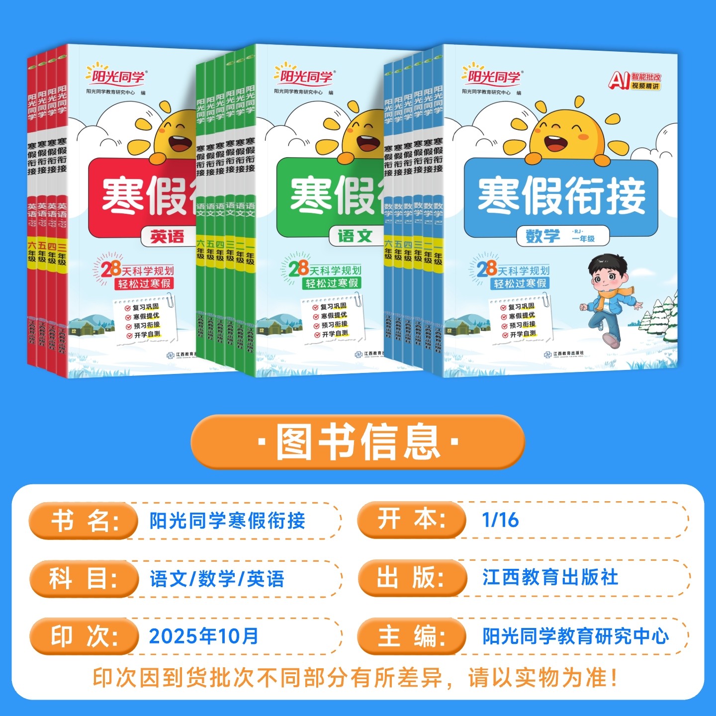 2026春《阳光同学寒假衔接》是一套专为小学一至六年级学生设计的寒假同步训练教材,涵盖人教版语文、数学、英语及北师大版、苏教版等主流版本,分年级配备上下册内容。本套练习紧扣新课标要求,科学衔接学期知识,兼顾复习与预习功能,帮助学生巩固上学期重点、提前熟悉新学期内容。题型丰富多样,难易适中,配有详细解析,便于学生自主学习和家长辅导。通过系统训练,有效提升学习效率,培养良好学习习惯,是寒假期间查漏补缺、夯实基础的理想选择,助力孩子在新学期赢在起跑线。