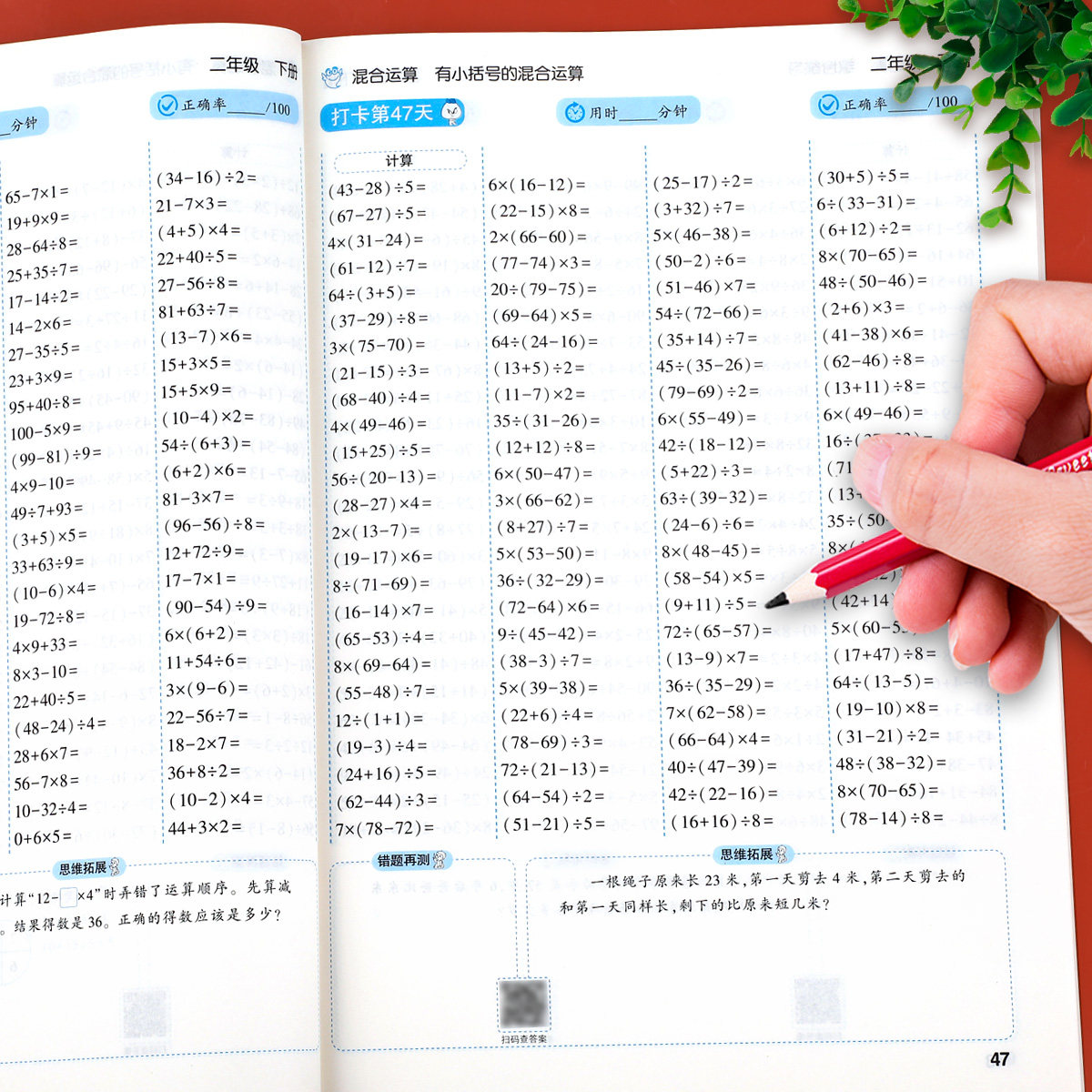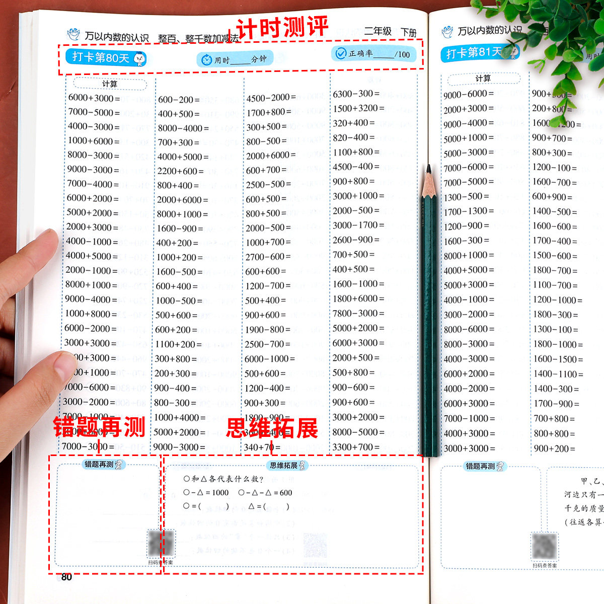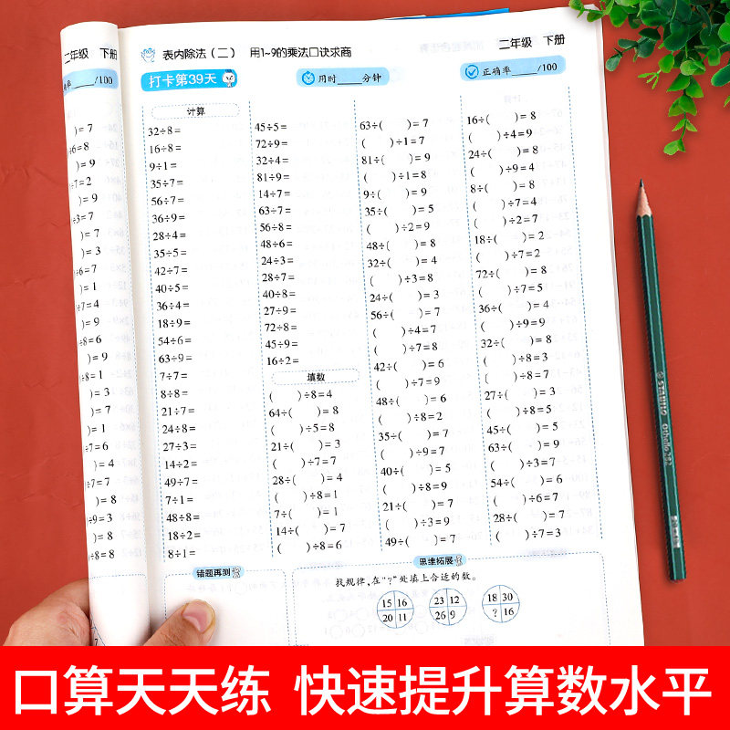 《二年级口算天天练》下册与人教版教材同步,专为小学二年级学生设计,每日100题,系统强化加减乘除混合运算能力。全书包含超10000道精选口算题,题型丰富、梯度合理,涵盖表内乘法、除法、加减法及综合运算,帮助学生夯实计算基础,提升运算速度和准确率。每日一练,养成良好学习习惯,适合课堂巩固、课后复习及家庭辅导。题目编排科学,由易到难,循序渐进,有效激发孩子学习兴趣,培养数学思维。是二年级学生提升口算能力的得力助手,助力数学学习轻松高效通关。