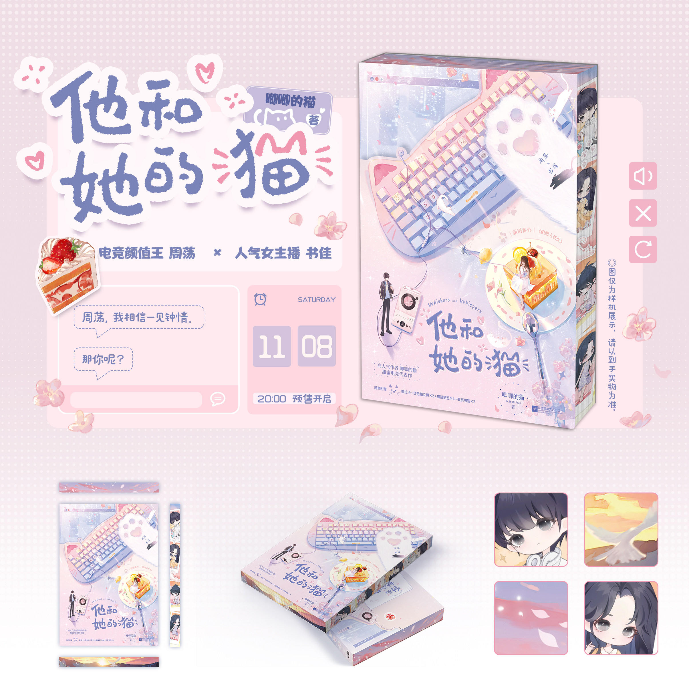 《他和她的猫》是唧唧的猫创作的电竞言情小说,近期推出畅销实体书正版,由磨铁图书发行。本书讲述电竞大神与元气少女之间的甜蜜互动,风格清新治愈,深受读者喜爱。现推出前665名亲签版,限时11月8日至9日发售,更有特签+光栅卡刷边版可选,极具收藏价值。亲签版附赠精美周边,光栅卡设计炫酷,刷边工艺提升质感,满足粉丝收藏需求。作为现象级言情作品,《她的小梨涡》同作者力作,本书延续细腻笔触与高甜剧情,是书迷不可错过的珍藏版本。正版保障,品质精良,值得入手。