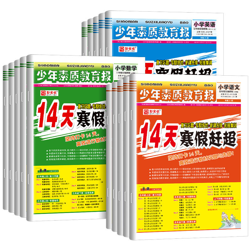 《小学生14天寒假赶超新全优少年素质教育报》专为1-6年级学生设计,涵盖语文、数学、英语三科,同步冀教版、人教版教材,助力寒假高效衔接。通过科学规划的14天训练,每天精选基础巩固与能力提升习题,兼顾知识复习与新课预习,题型丰富、难度适中,注重思维训练与习惯培养。内容紧贴课标,突出重难点,配有详细解析,便于自学自查。不仅夯实学科基础,更激发学习兴趣,培养自主学习能力,是寒假弯道超车、实现全面发展的优质助学资料,让孩子轻松领跑新学期。