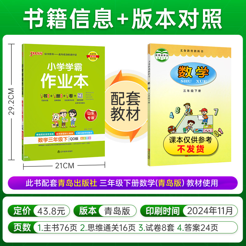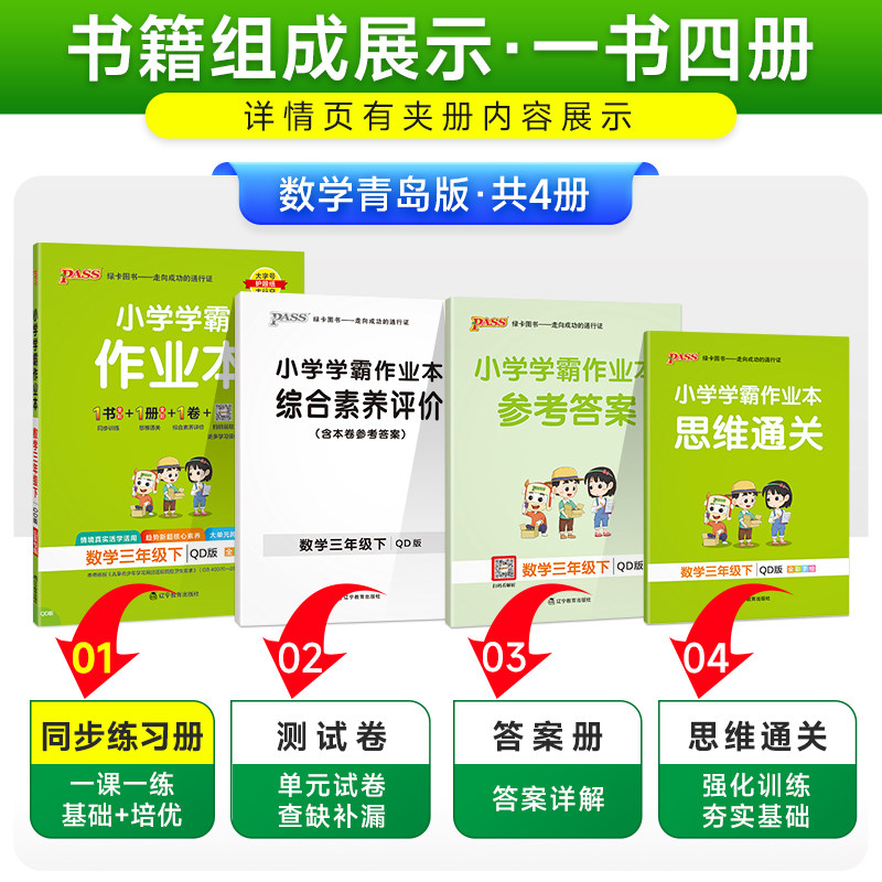 青岛版六三制《2025小学学霸作业本·数学》三年级上下册同步练习册,紧扣新课标与教材内容,专为三年级学生设计。本书涵盖课时天天练、一课一练、单元测试卷及期中期末复习,题型丰富,梯度合理,注重基础知识巩固与思维能力拓展。特别设置应用题专项训练,强化数学在实际生活中的运用能力。搭配pass绿卡图书高效学习法,帮助学生掌握重点、突破难点,提升解题效率。题目设计贴近生活,图文并茂,激发学习兴趣,是学生夯实基础、提升成绩的理想同步练习资料,助力小学生轻松成为数学小学霸。