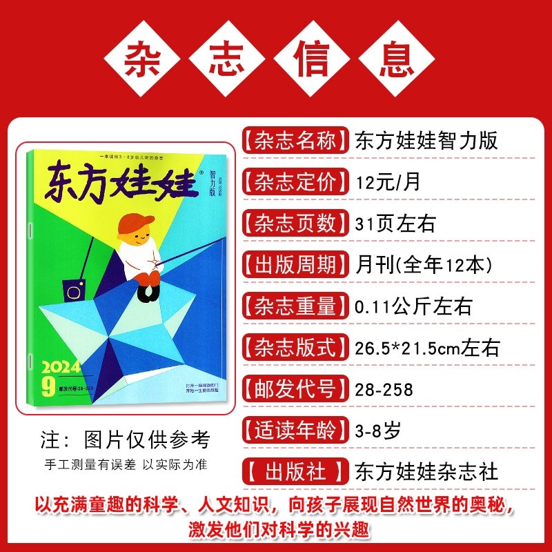 超值捡漏清仓!现推出《东方娃娃》系列杂志过刊,涵盖2022-2024年智力版、绘本版、美术版、科学版及数学版,专为3-7岁幼儿设计。每期内容优质丰富,融合创意故事、趣味游戏、艺术启蒙与科学探索,助力孩子全面发展。亲子共读温馨时光,睡前故事轻松开启智慧童年。单本低价出售,过刊不影响阅读体验,环保又实惠。无论是培养逻辑思维、审美能力,还是激发好奇心与想象力,都是不可多得的优质读物。数量有限,先到先得,为小朋友囤一份成长好礼!
