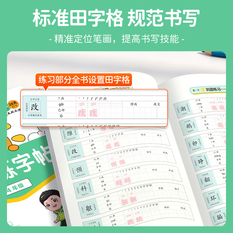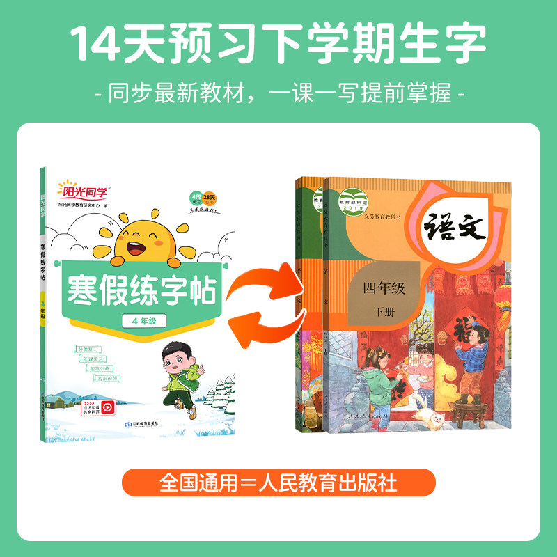 【官方旗舰店】2026新版阳光同学寒假练字帖,专为小学四年级学生设计,紧扣人教版语文教材,上下册同步编排,助力寒假高效预习。内容涵盖生字、词语、句段练习,兼顾控笔训练与书写规范,提升书写速度与美观度。每日一练,题型丰富,巩固课内知识的同时拓展课外积累。采用护眼纸张,排版清晰,书写舒适。搭配视频讲解,扫码即学,家长辅导更省心。既是寒假作业补充,也是练字提分利器,让孩子在假期轻松练好字、打好语文基础,开学赢在起跑线!