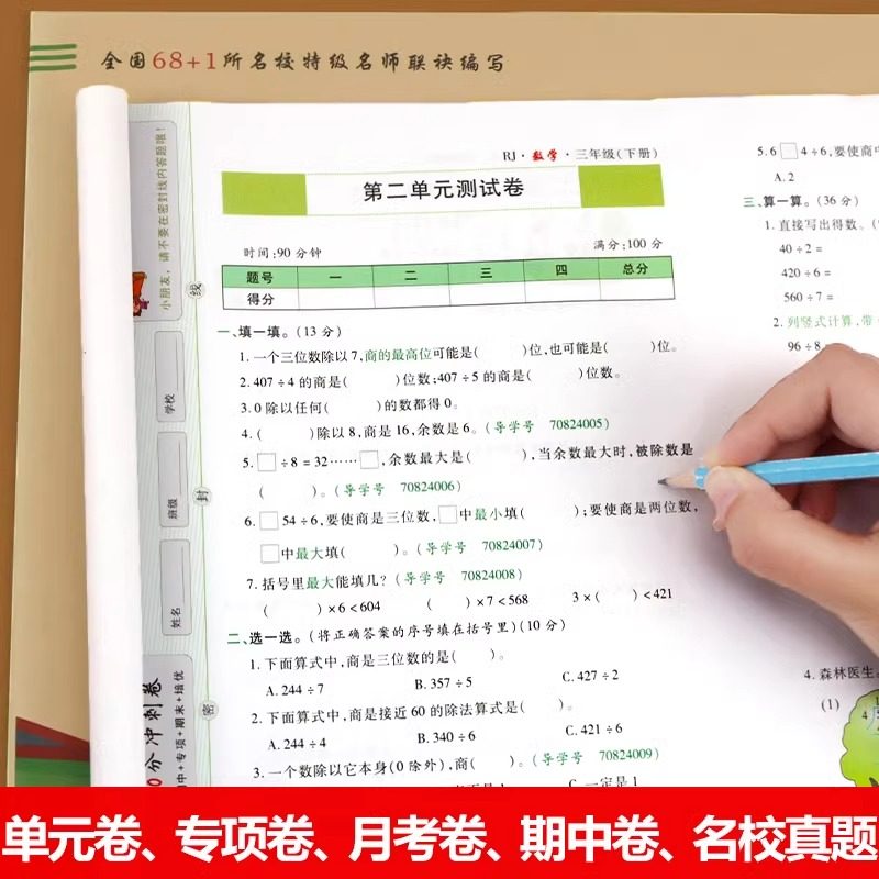 本《三年级上册试卷测试卷全套》涵盖人教版、北师大版及黄冈小状元系列,专为小学三年级上学期学生设计,包含语文、数学两科同步训练、单元测试卷、期中期末复习卷及100分冲刺卷。内容紧扣教材重点,题型丰富多样,难易适中,帮助学生巩固基础知识、提升解题能力。每套试卷均配有详细答案解析,便于学生自查自纠,家长辅导。通过系统练习,有效强化知识点掌握,提升综合应试水平,是学生日常练习、阶段检测和考前复习的理想辅助资料,助力孩子在学期中取得优异成绩。
