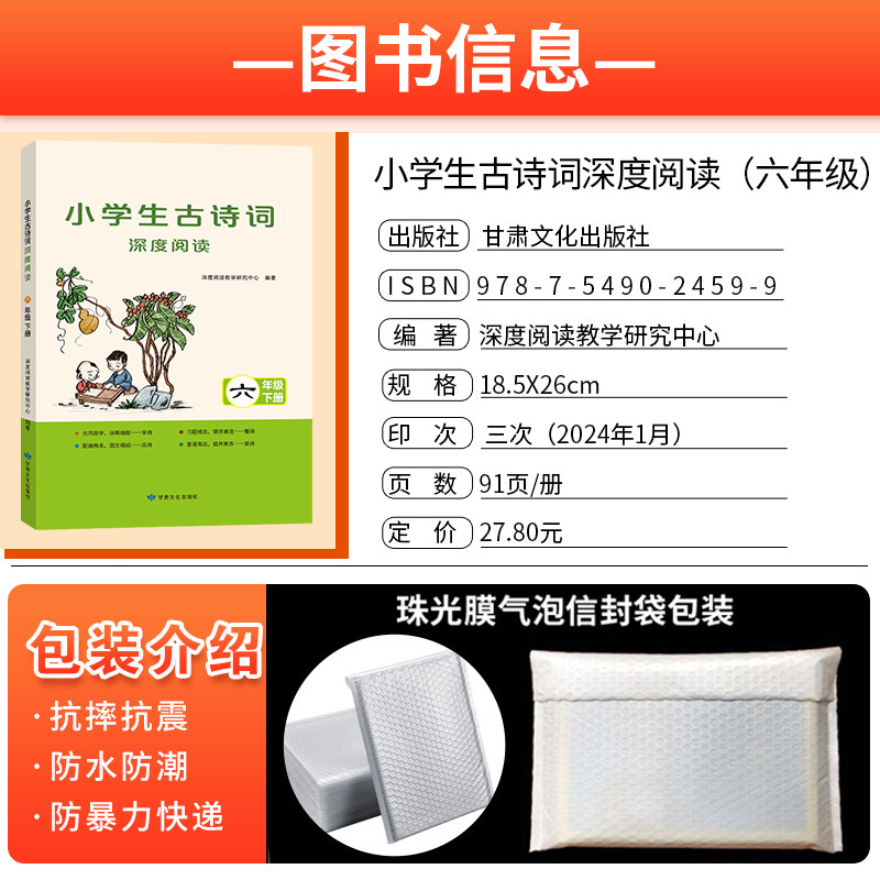 2026春版《小学生古诗词深度阅读·六年级下册》是一本专为小学六年级学生打造的全彩版古诗词专项训练提升练习册。本书紧扣新课标要求,精选教材必背古诗词,设置“诗词诵读”“文意理解”“意境赏析”“名句积累”“拓展延伸”“实战演练”六大模块,系统提升学生的古诗词素养。每首诗均配有名师精讲视频课程,深入浅出讲解背景、情感与艺术特色,帮助学生真正读懂、悟透。习题设计科学分层,兼顾基础巩固与能力提升,图文并茂,趣味性强,助力学生在小升初备考中夯实语文基础,提升文学鉴赏能力与应试水平。