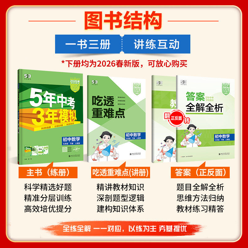 《2026春53五年中考三年模拟》系列同步练习册,涵盖七年级至九年级语文、数学、英语、物理、地理、历史等学科,依据人教版教材编写,紧扣新课标与中考考点。丛书精选近五年中考真题与三年优质模拟题,科学分层训练,讲练结合,帮助学生夯实基础、突破重难点。配套“53天天练”强化日常巩固,题型丰富、难度梯度合理,适合课堂同步学习与课后复习。作为初中阶段必备刷题资料,本书注重能力提升与应试技巧培养,是学生夯实知识、备战中考的高效学习工具,广受师生信赖与推荐。
