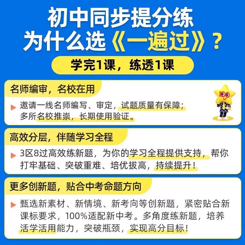 《2026初中一遍过》是一套专为七年级至九年级学生设计的高效同步练习册,涵盖数学、物理、化学、语文、英语、生物、政治、历史、地理等全学科,适配人教版、北师大版、外研版、译林版等多种教材版本。本书紧扣新课标要求,系统梳理知识点,精选典型例题与分层训练题,注重基础巩固与能力提升并重。通过“讲—练—测”一体化设计,帮助学生一课一清、章章过关,真正实现“学过就能掌握”。作为天星教育推出的必刷题系列,它兼具科学性、实用性与前瞻性,是初中生夯实基础、突破重难点、备战中考的理想学习伴侣。