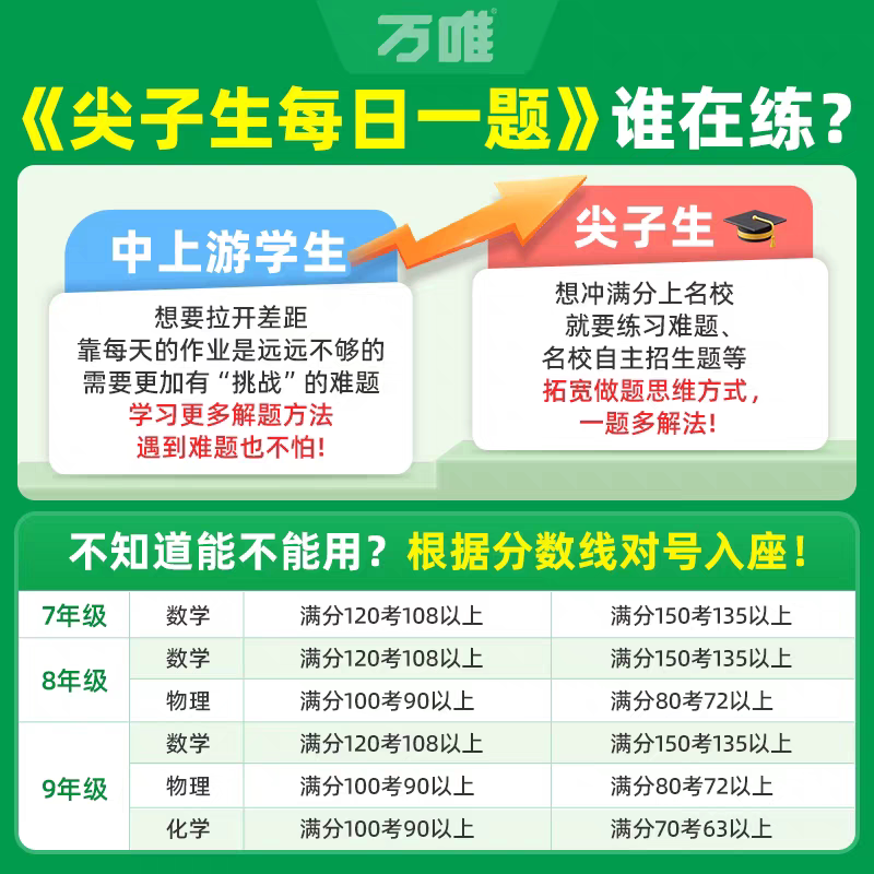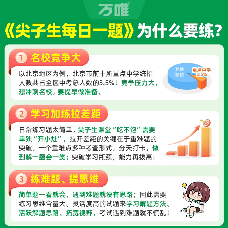 《唯中考尖子生每日一题2025》是专为七至九年级学生打造的数学、物理、化学专项训练教辅书,紧扣新课标与中考考点,精选高频题型与典型例题。本书按学期分册,每日一题设计科学合理,兼顾基础巩固与能力提升,涵盖计算、应用、综合拓展等模块,助力学生夯实基础、突破难点。题目难度梯度分明,配有详细解析与思路点拨,适合初二及初中各年级学生同步练习与考前冲刺。通过系统训练,有效提升解题速度与准确率,是冲刺满分的优质辅导资料,广受师生好评。