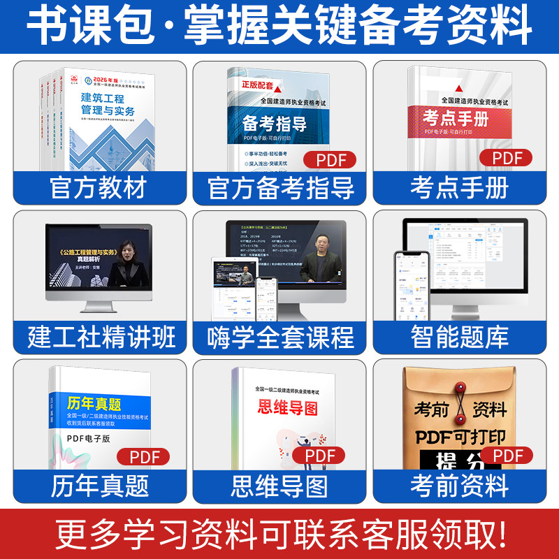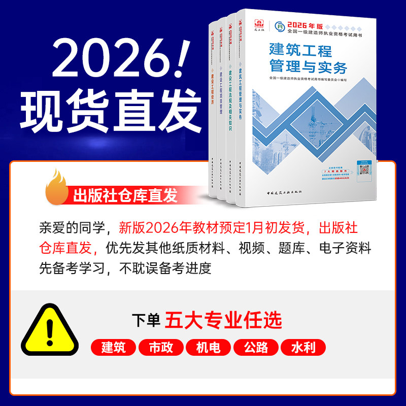 2026年一级建造师考试官方教材由建工社权威出版,涵盖建筑、市政、机电、通信、公路、水利等专业科目,紧扣最新考试大纲,内容全面、重点突出。配套2025年历年真题试卷及精选习题集题库,帮助考生熟悉命题规律,强化实战能力。特别赠送高清精讲课程与案例专题解析,深入剖析高频考点与实务难点,提升应试效率。教材融合法规、项目管理等核心知识体系,结构清晰,便于系统复习。无论是零基础考生还是冲刺提分者,都能通过本套用书实现高效备考,是备战2026年一建考试的必备权威资料。