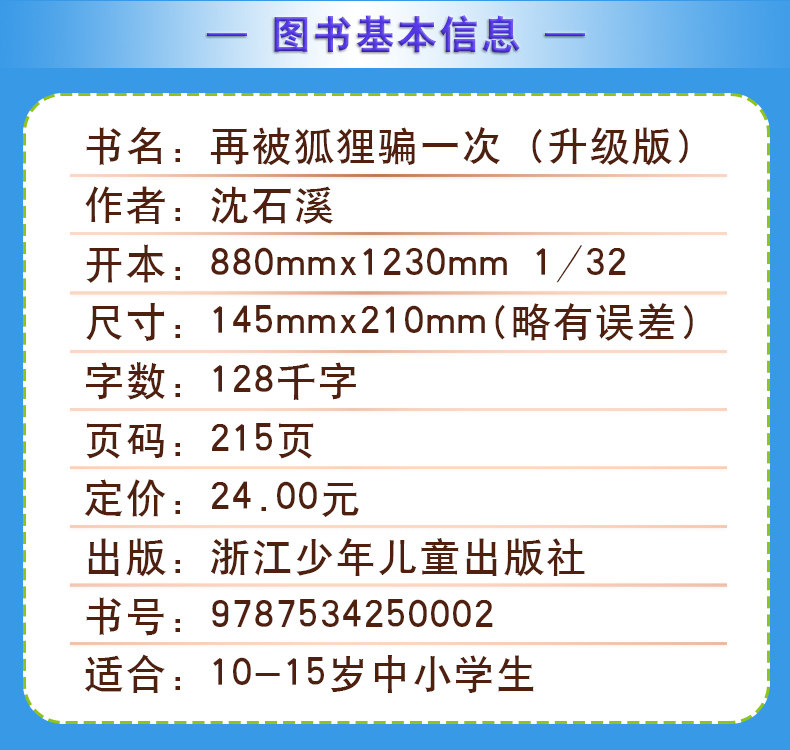 《再被狐狸骗一次》是著名动物小说作家沈石溪创作的正版动物小说经典,收录于“动物小说大王品藏书系”,由浙江少年儿童出版社推出,专为小学四年级至五年级学生设计。本书为非注音版完整版,语言生动,情节曲折,通过一个个真实感人的动物故事,展现野生动物的生存智慧与情感世界。作品以狐狸为主角,讲述人与动物之间的误解、信任与感动,引导小读者尊重生命、热爱自然。作为课外阅读经典,本书不仅提升阅读能力,更培养同理心与责任感,是沈石溪动物小说代表作之一,深受师生和家长推荐,适合高年级小学生独立阅读。