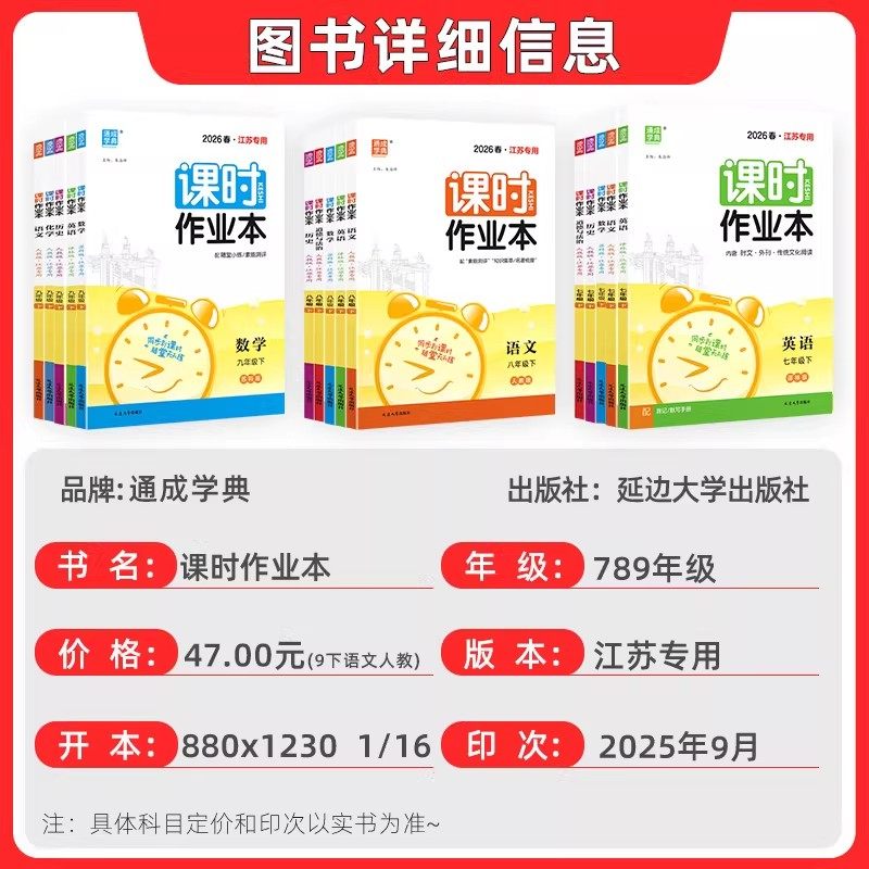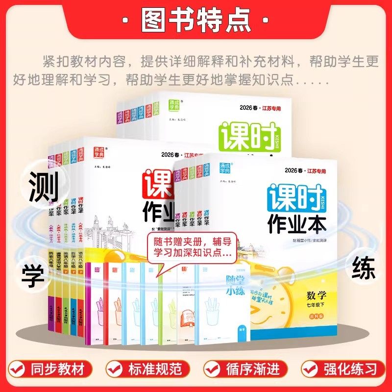 2026春新版《课时作业本》(七至九年级上下册)专为江苏南通地区初中学生打造,涵盖语文、数学、英语、物理、化学、历史、政治等学科,同步苏科版、译林版、沪教版及人教版教材,适配南通本地教学实际。丛书由“通城学典”精心编写,紧扣新课标与中考考点,课时划分科学,题型丰富多样,注重基础巩固与能力提升并重。每课时包含知识梳理、典例精析、分层训练等环节,讲练结合,助力学生高效掌握课堂内容。答案详解详析,便于自主学习与复习检测,是南通初中生课前预习、课堂巩固、课后复习的理想教辅资料。