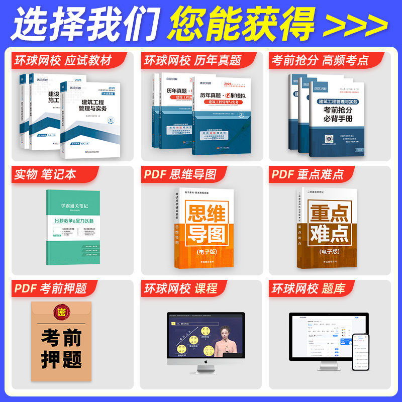 2026年环球网校二级建造师考试教材配套资料,涵盖《建设工程施工管理》《建设工程法规及相关知识》及《专业工程管理与实务》(建筑、机电、市政、公路、水利水电等专业),精选历年真题试卷与高频押题章节习题,紧扣最新考试大纲与官方命题趋势。题库系统全面,题型贴近实战,助力考生高效掌握核心考点,强化应试能力。内含必刷题库与详细解析,支持多终端练习,是备考二建的权威学习工具,帮助考生夯实基础、突破重点,顺利通过考试。